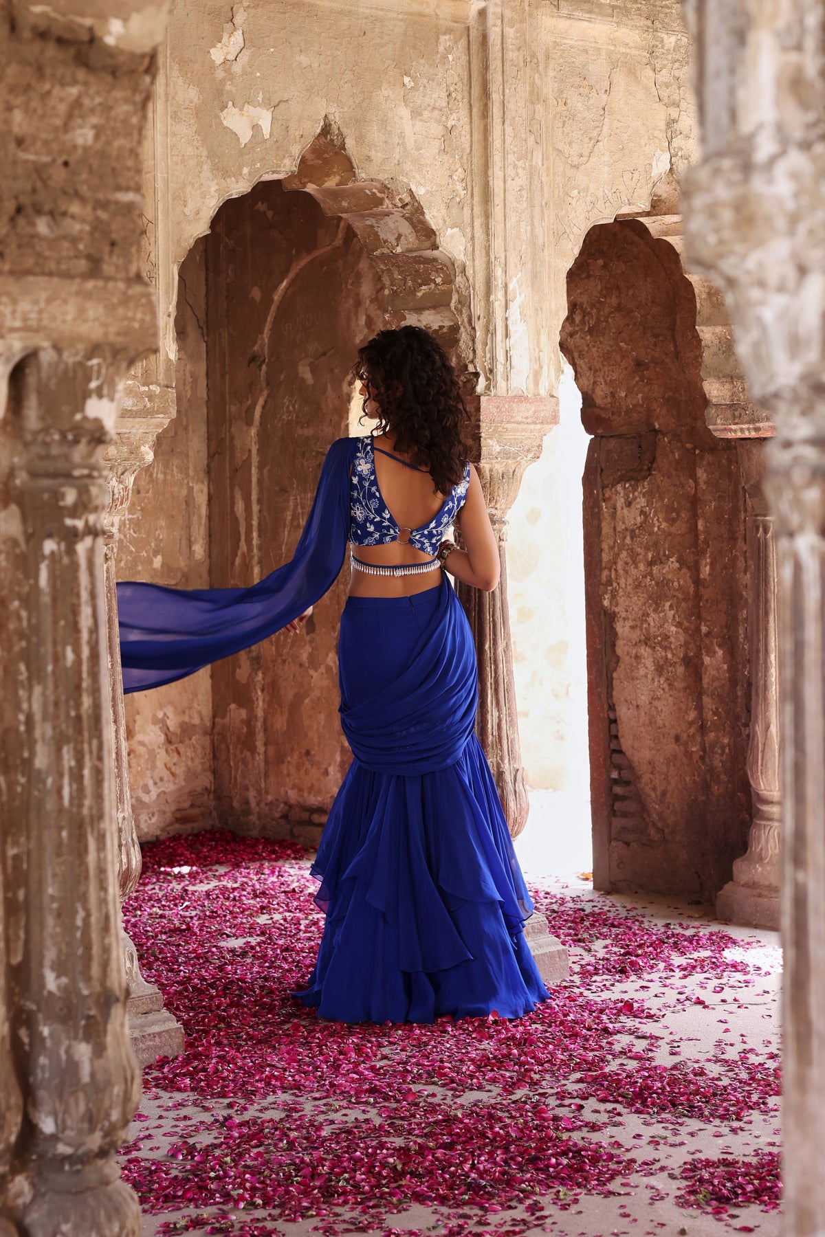 Embellished choli paired with an embellished prestitched asymetric saree with cancan.