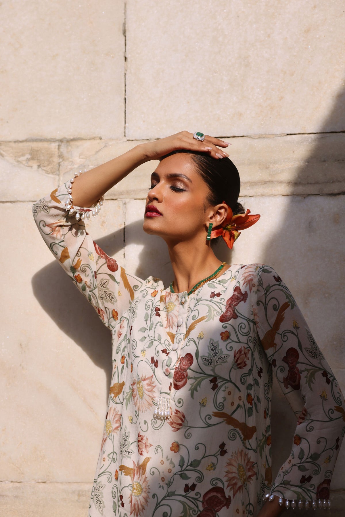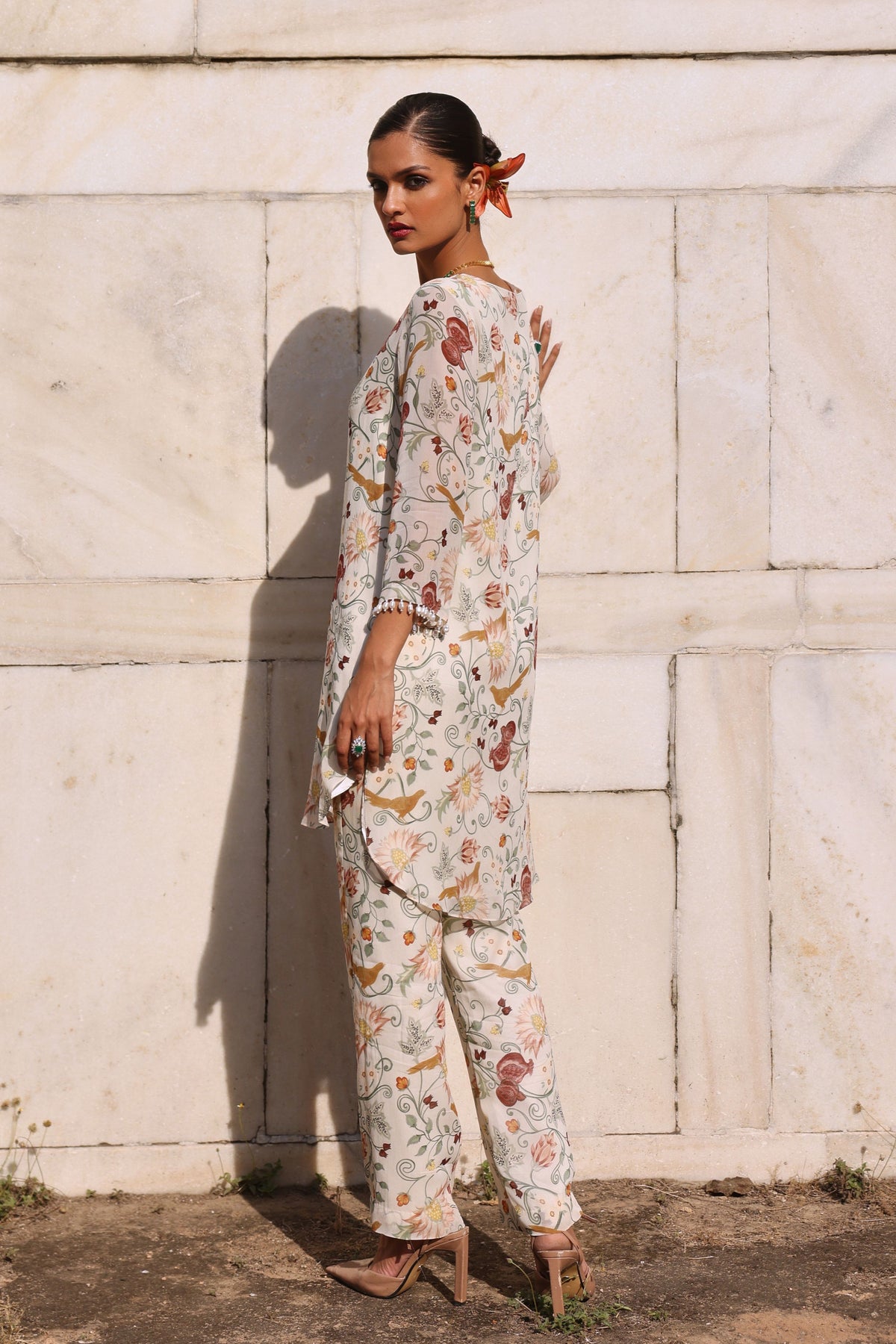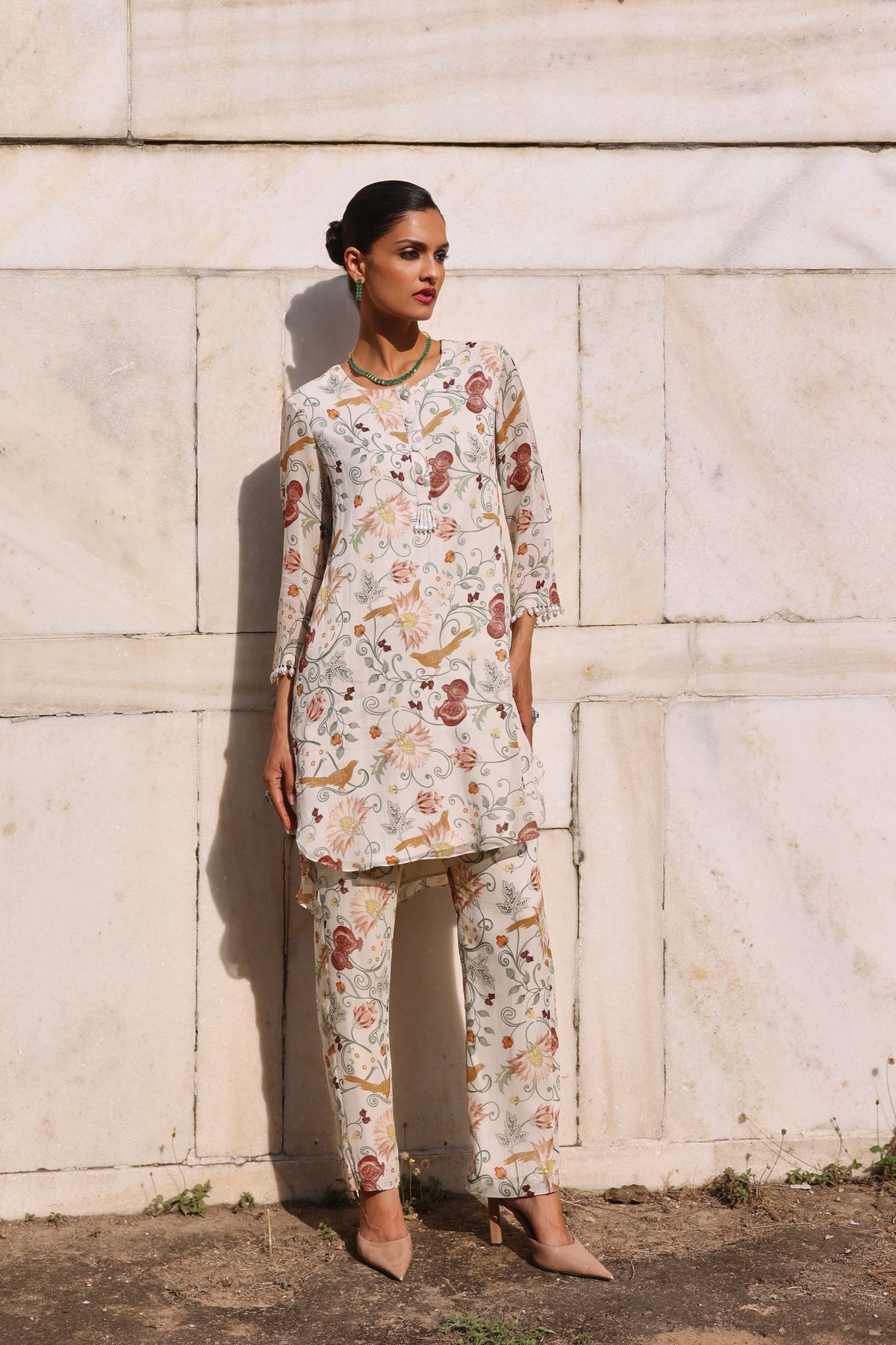 Printed kurta with tassels on sleeves and neckline paired with printed pants