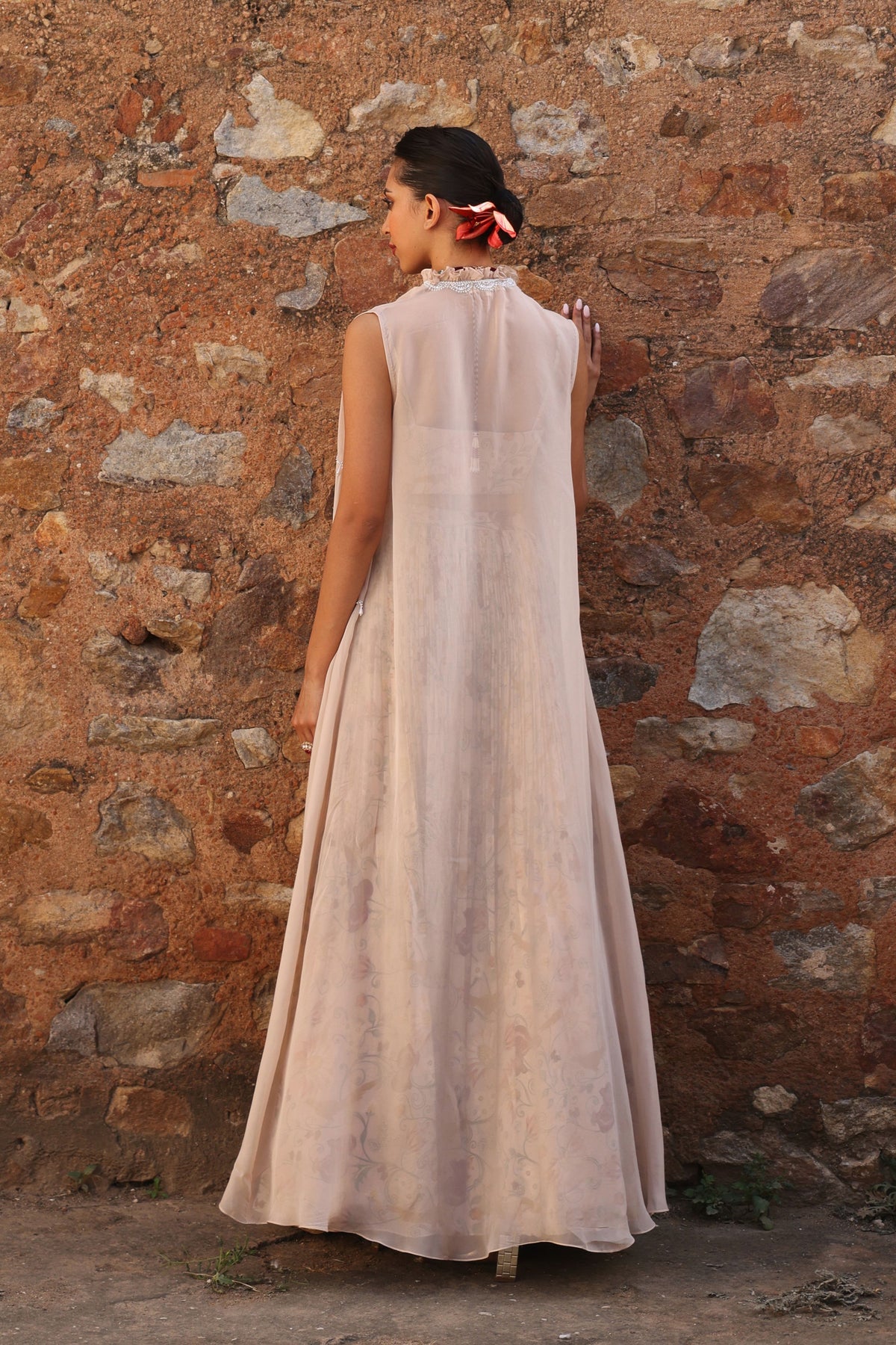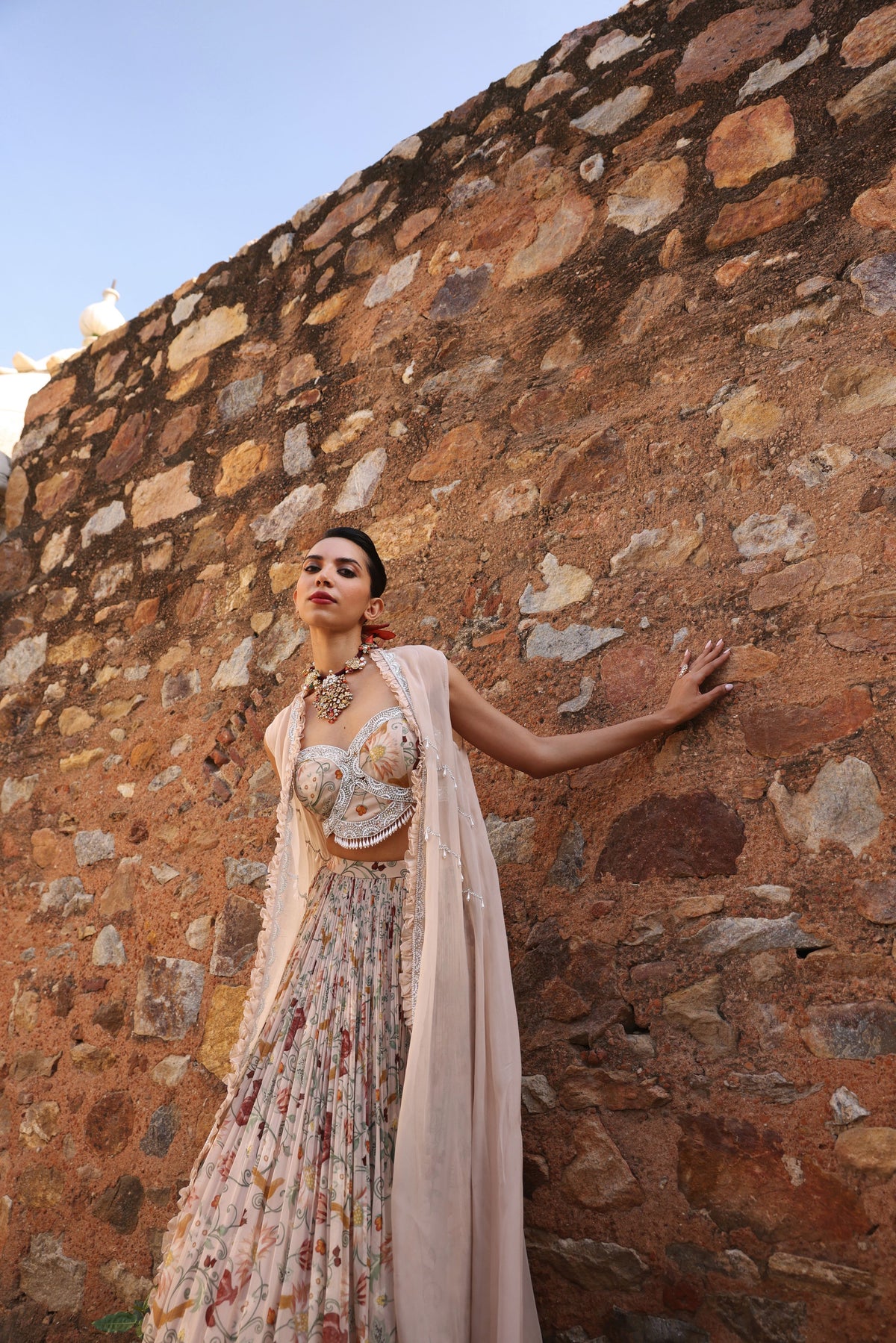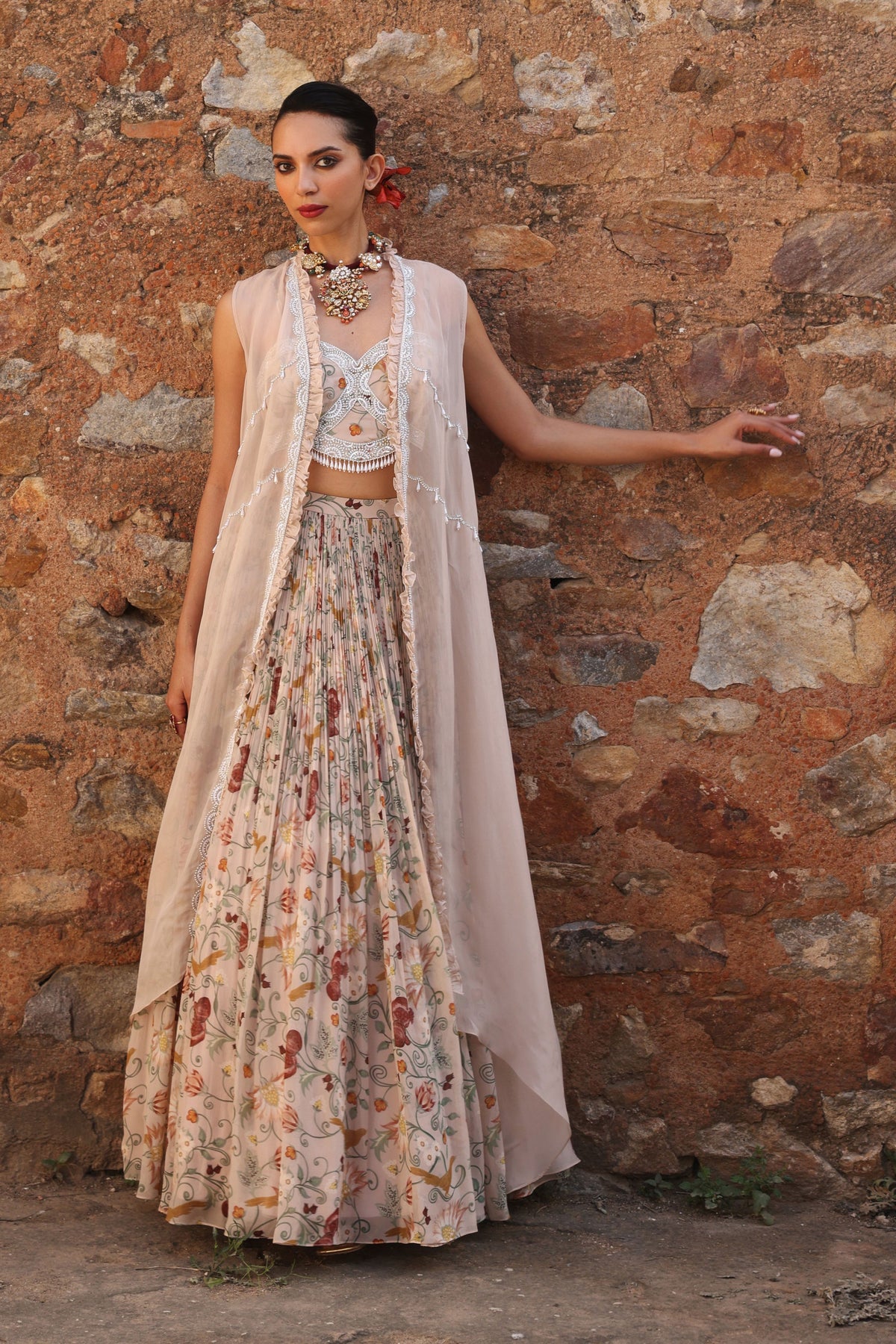 Embellished printed choli paired with an embellished cape plus printed circular skirt