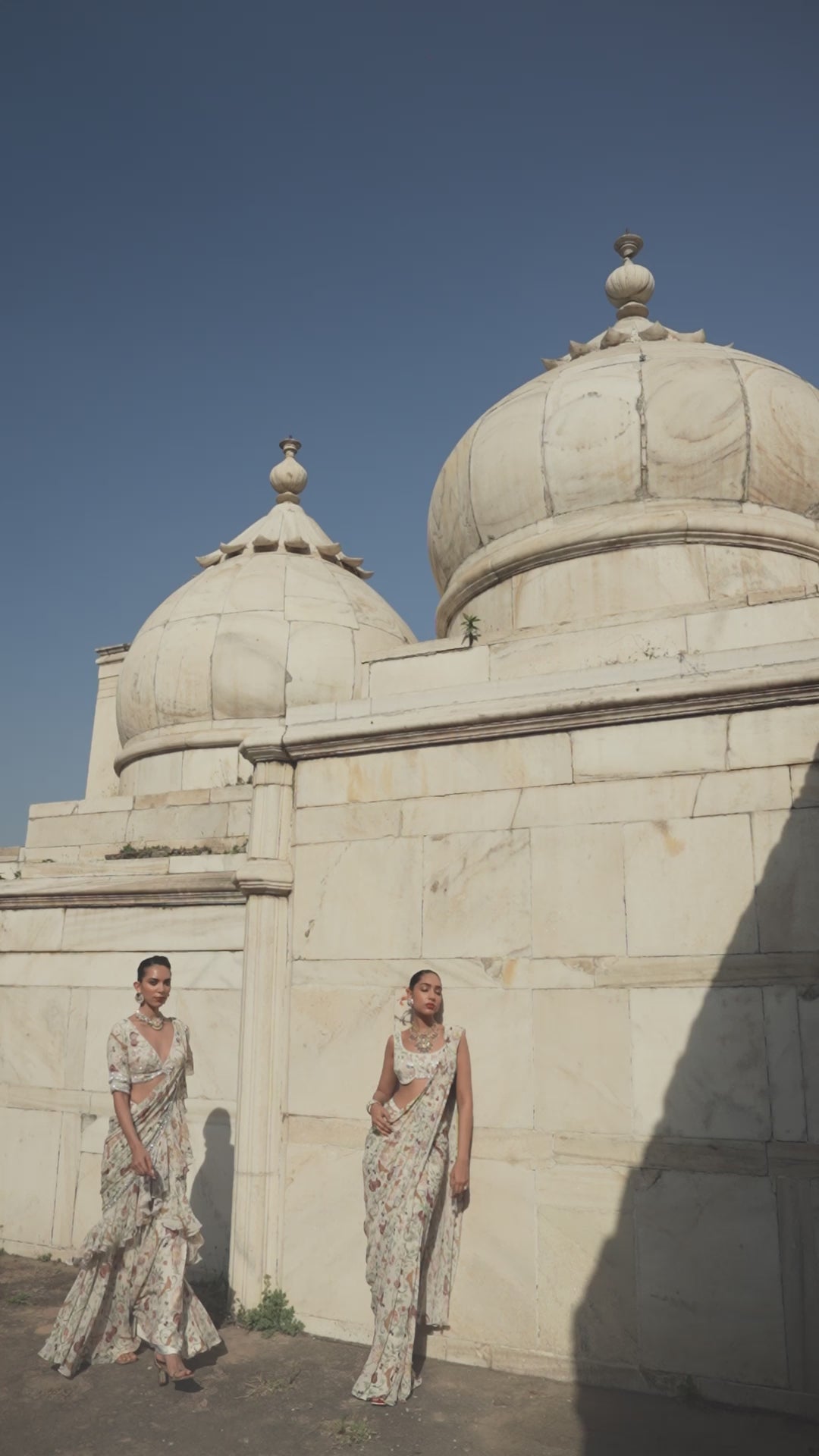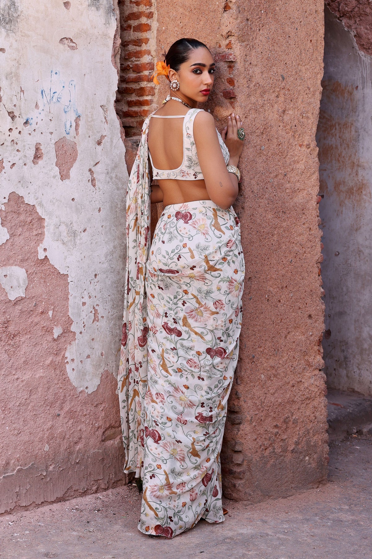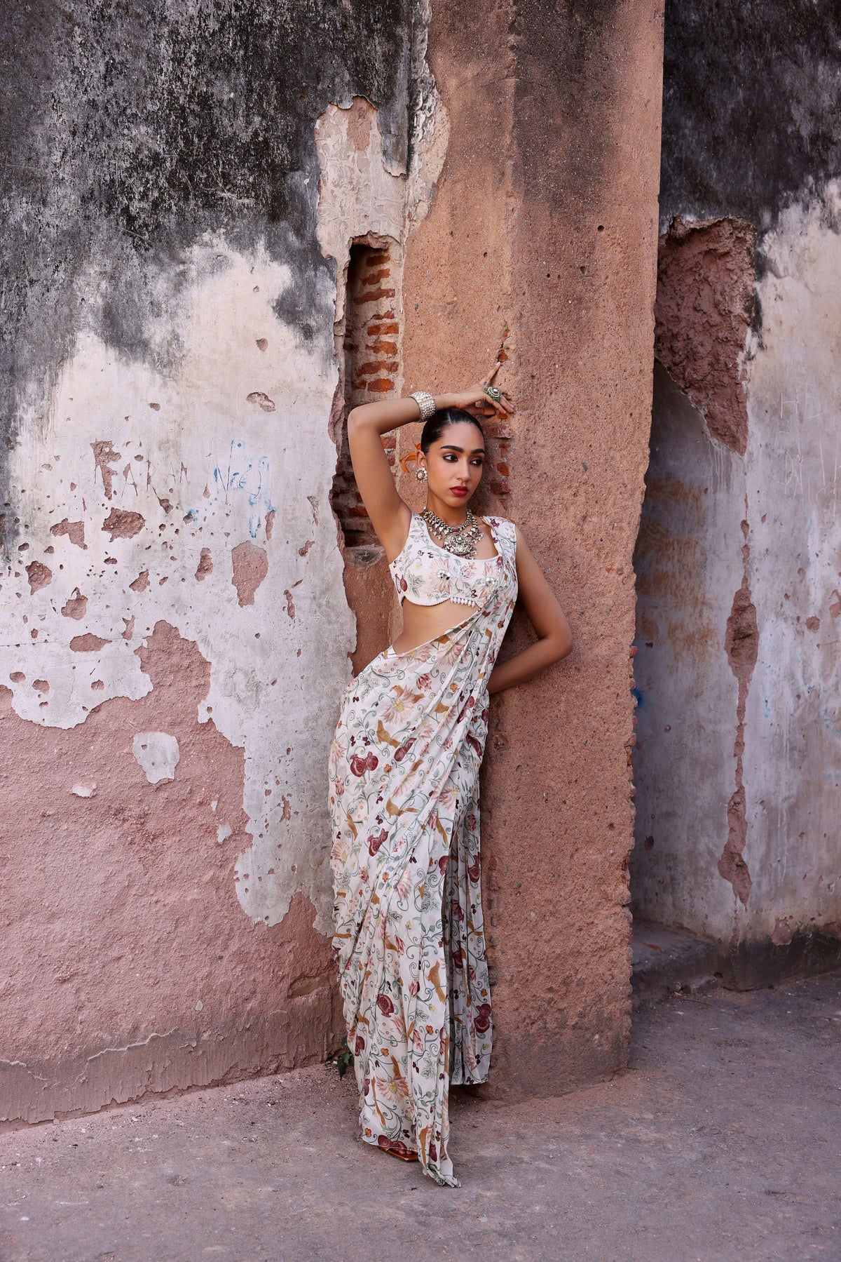 Embellished printed choli with applique work paired with a pre-stitched printed saree