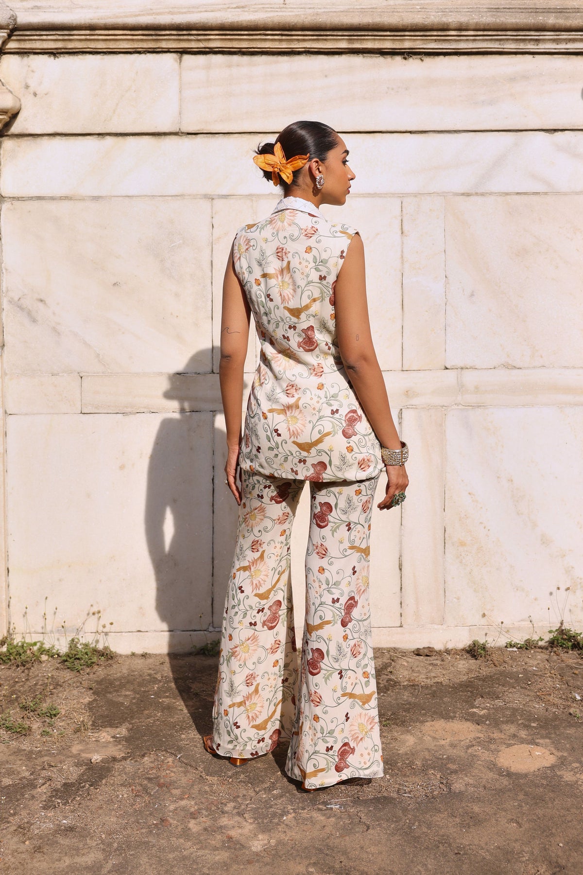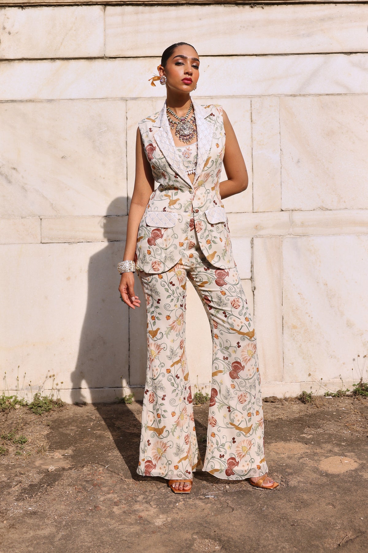 Embellished printed choli with applique work paired with an embellished printed jacket plus printed pants
