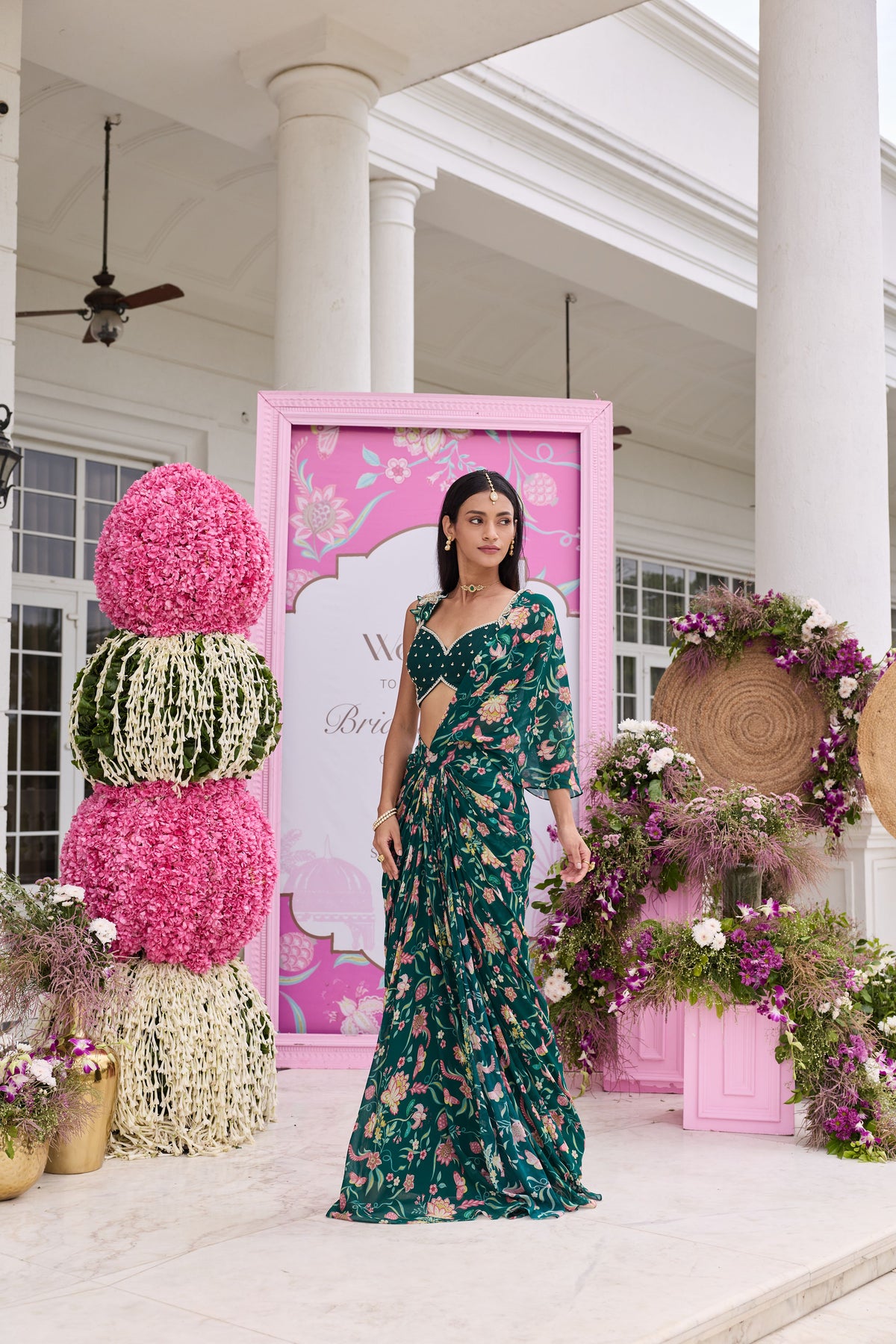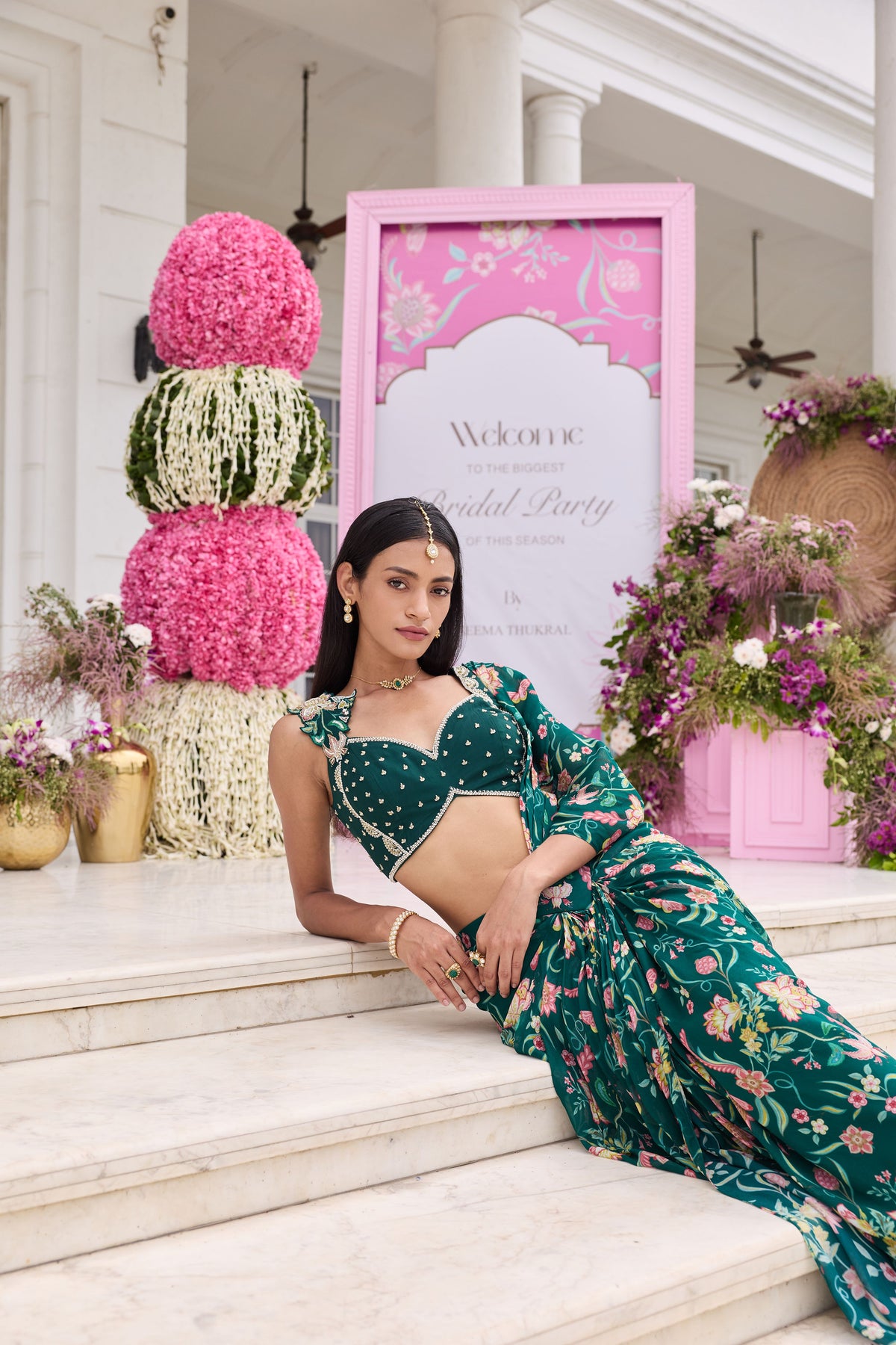 Embellished Choli Paired With A Printed Saree Style Draped Skirt