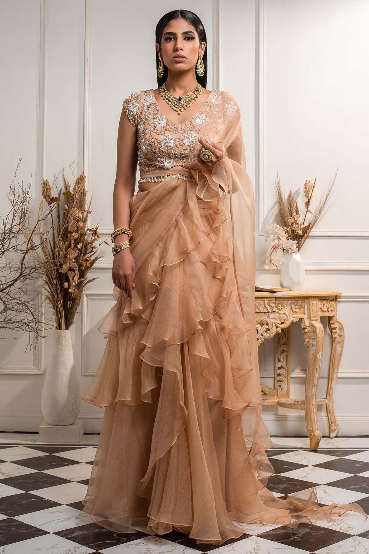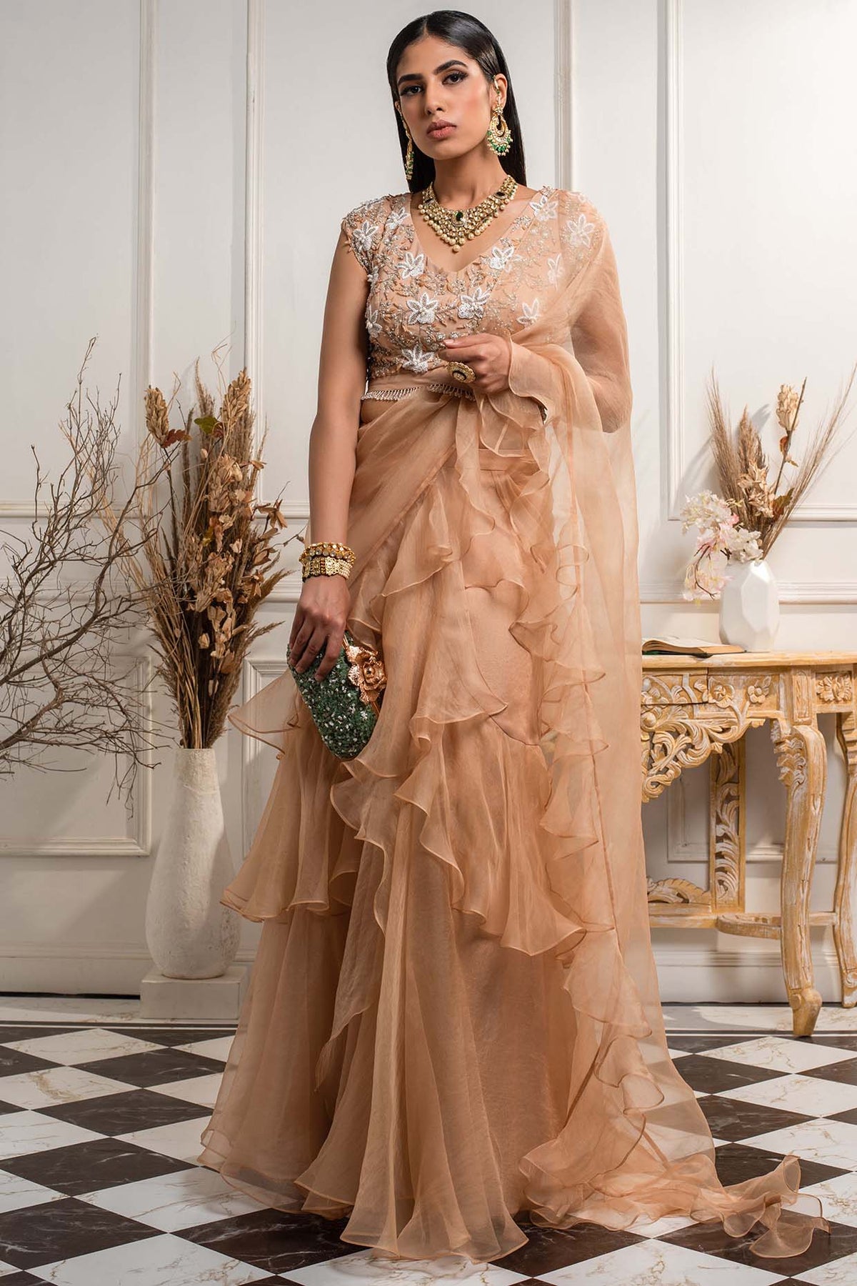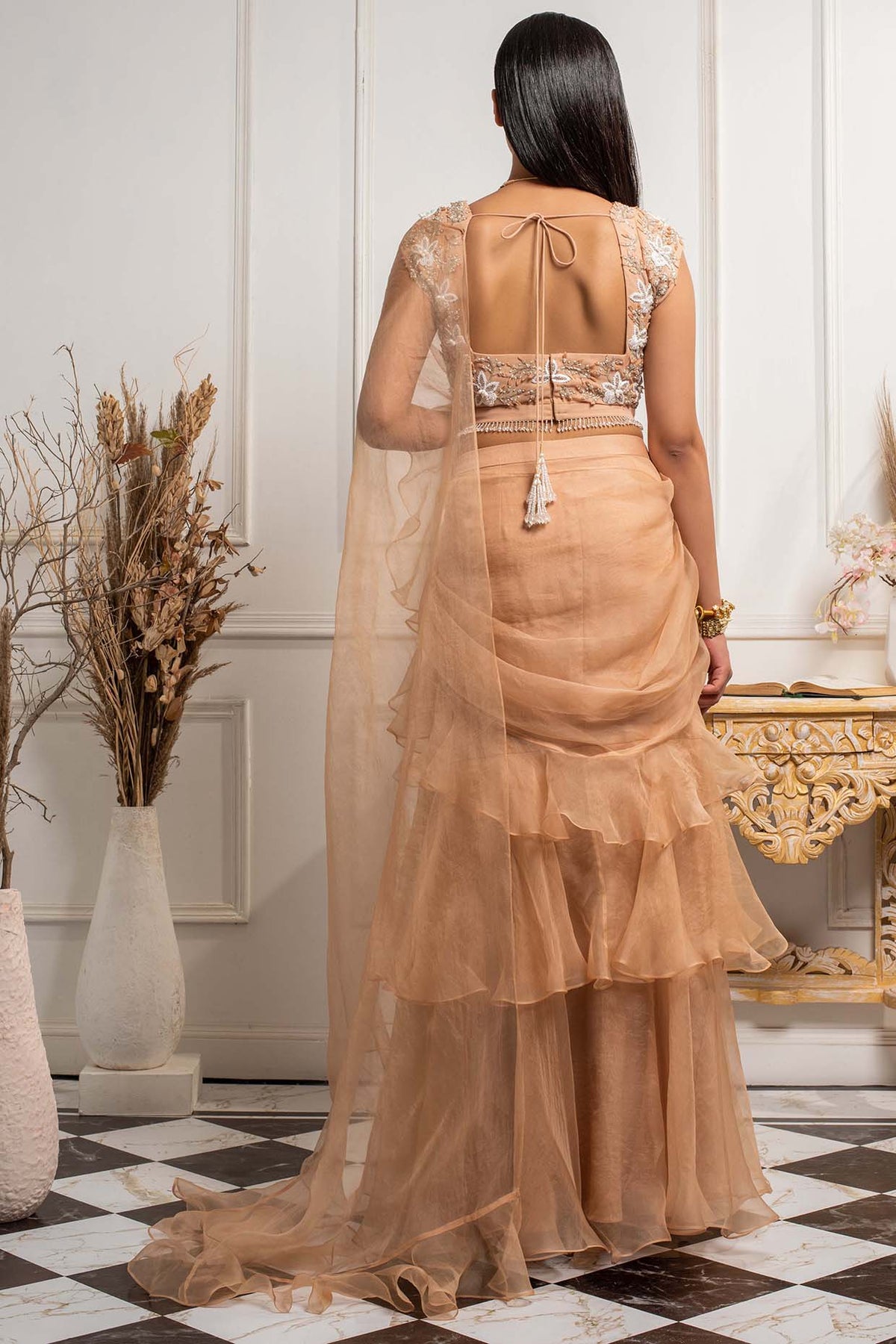 Featuring A Beige Saree In Organza Base With Pre-Draped Ruffles. It Is Paired With A Matching Pure Georgette Blouse Having Tassels, Glass Beads, And Pearls Embellishments.