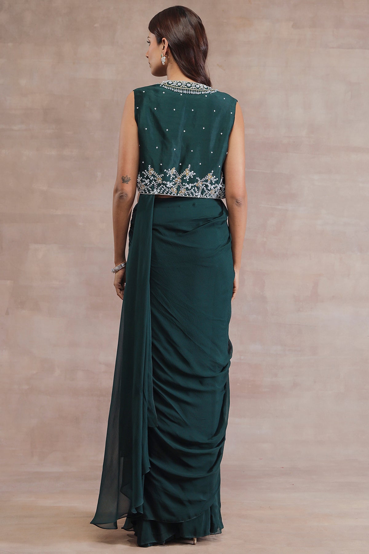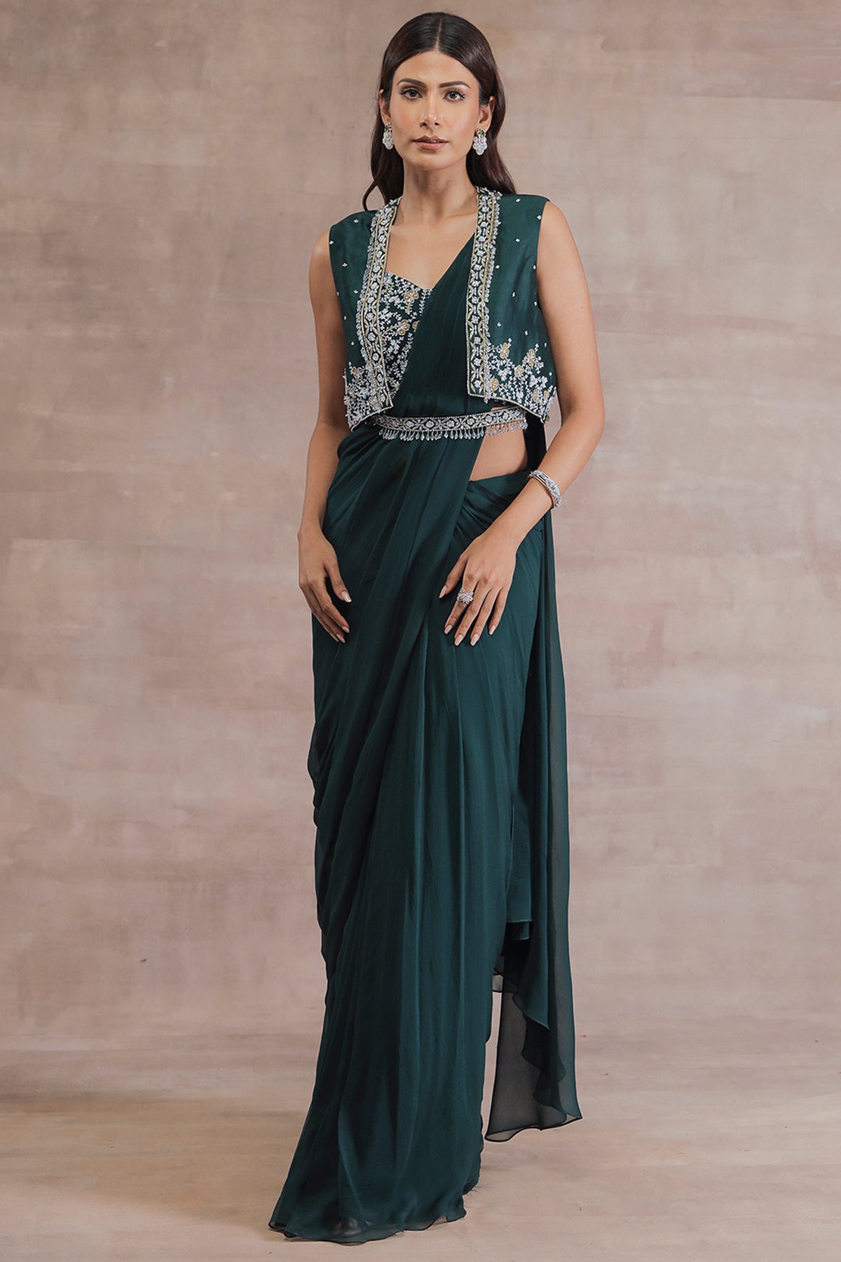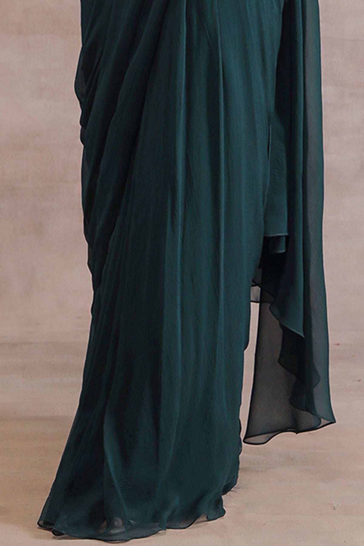 Featuring A Bottle Green Stitched Saree In Chiffon Base. It Is Paired With A Matching Chanderi Short Jacket, A Belt, And A Blouse Having Patch Work, Glass Beads, Crystals ,And Sequins Hand Embroidery, Chanderi Jacket And A Belt.