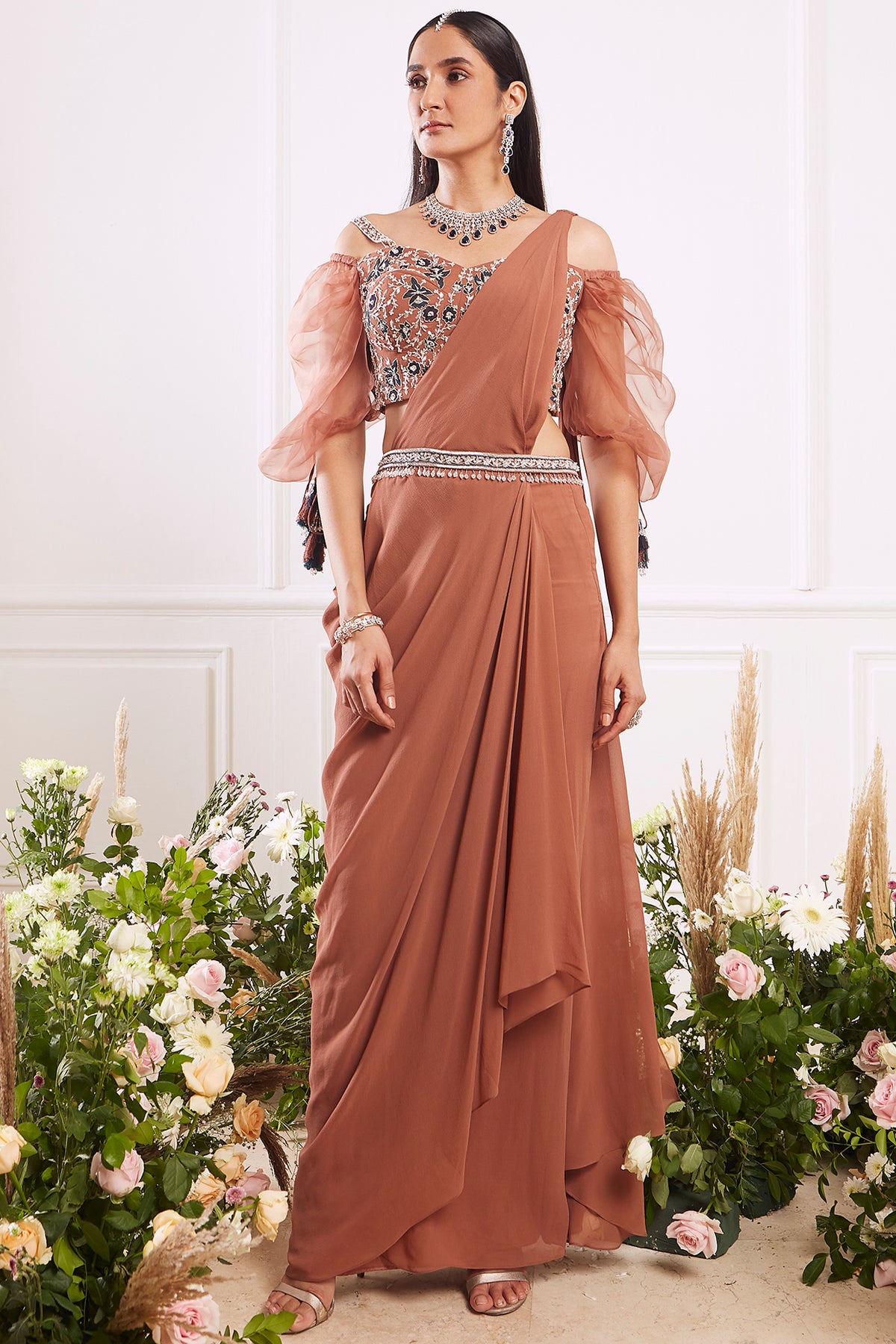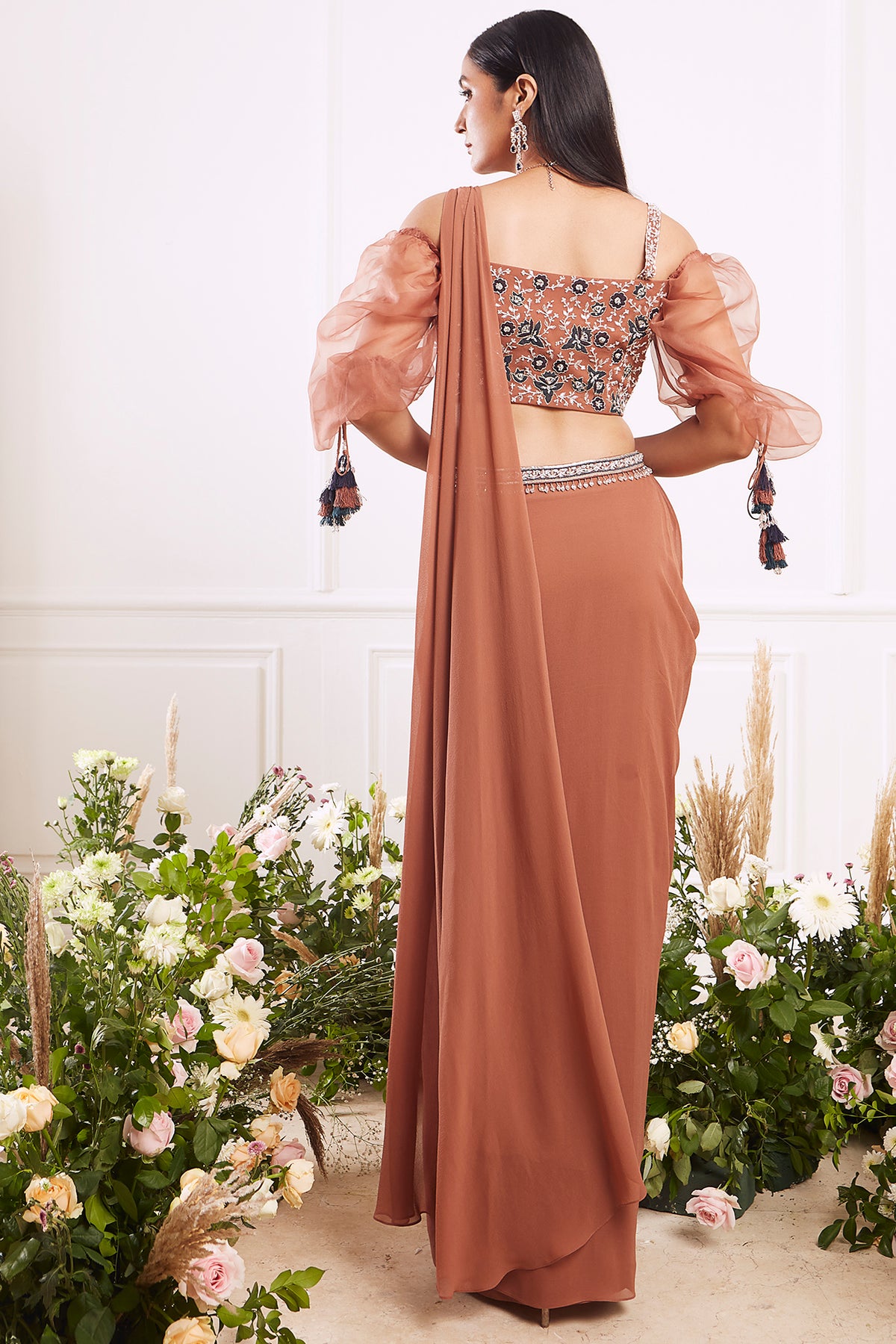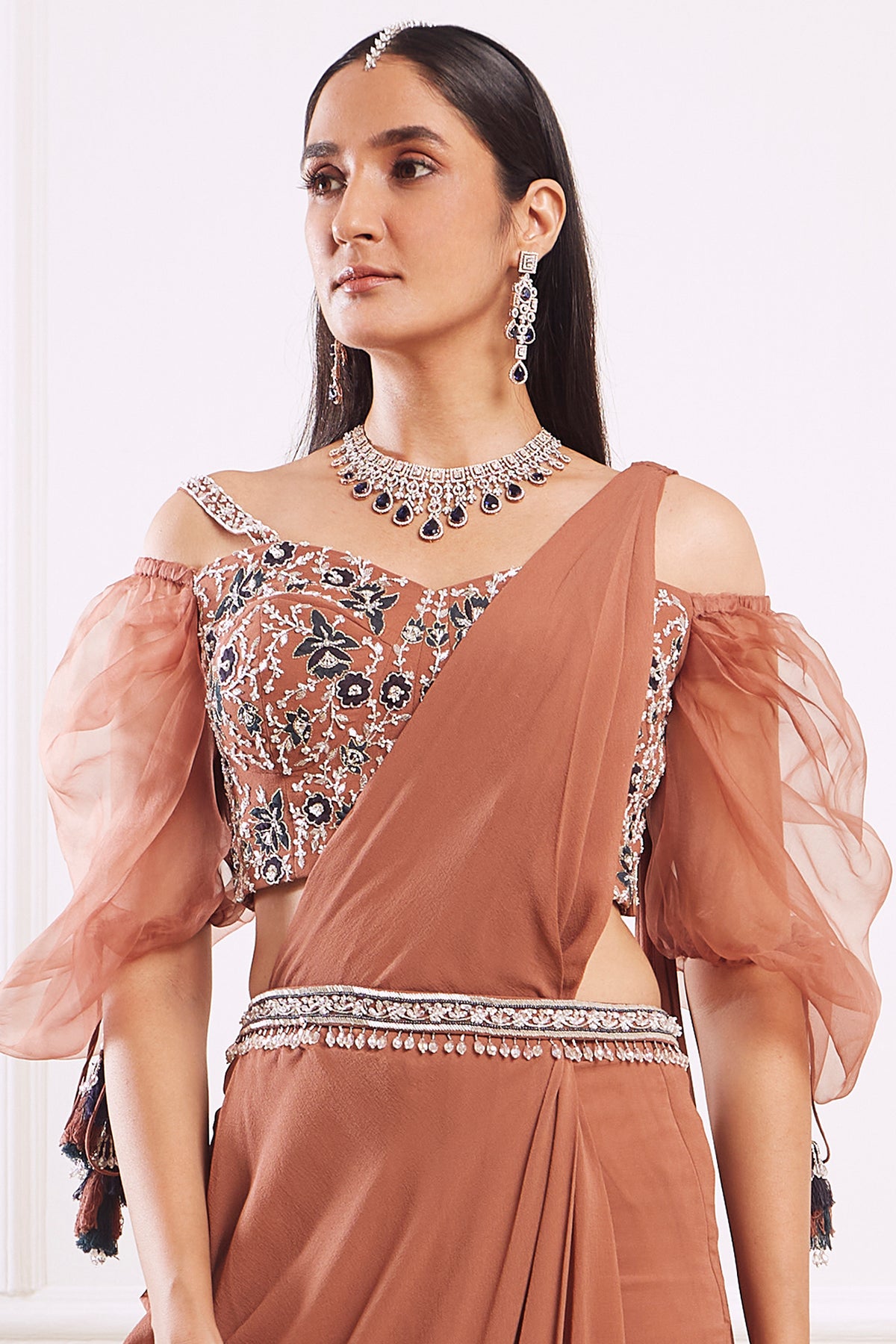 Featuring A Brown Pre-Stitched Saree In Georgette Base. It Is Paired With A Matching Blouse Having Puffed Organza Sleeves And Pom-Poms Including Glass Beads, Crystal, And Sequins Hand Embroidery, And A Belt.