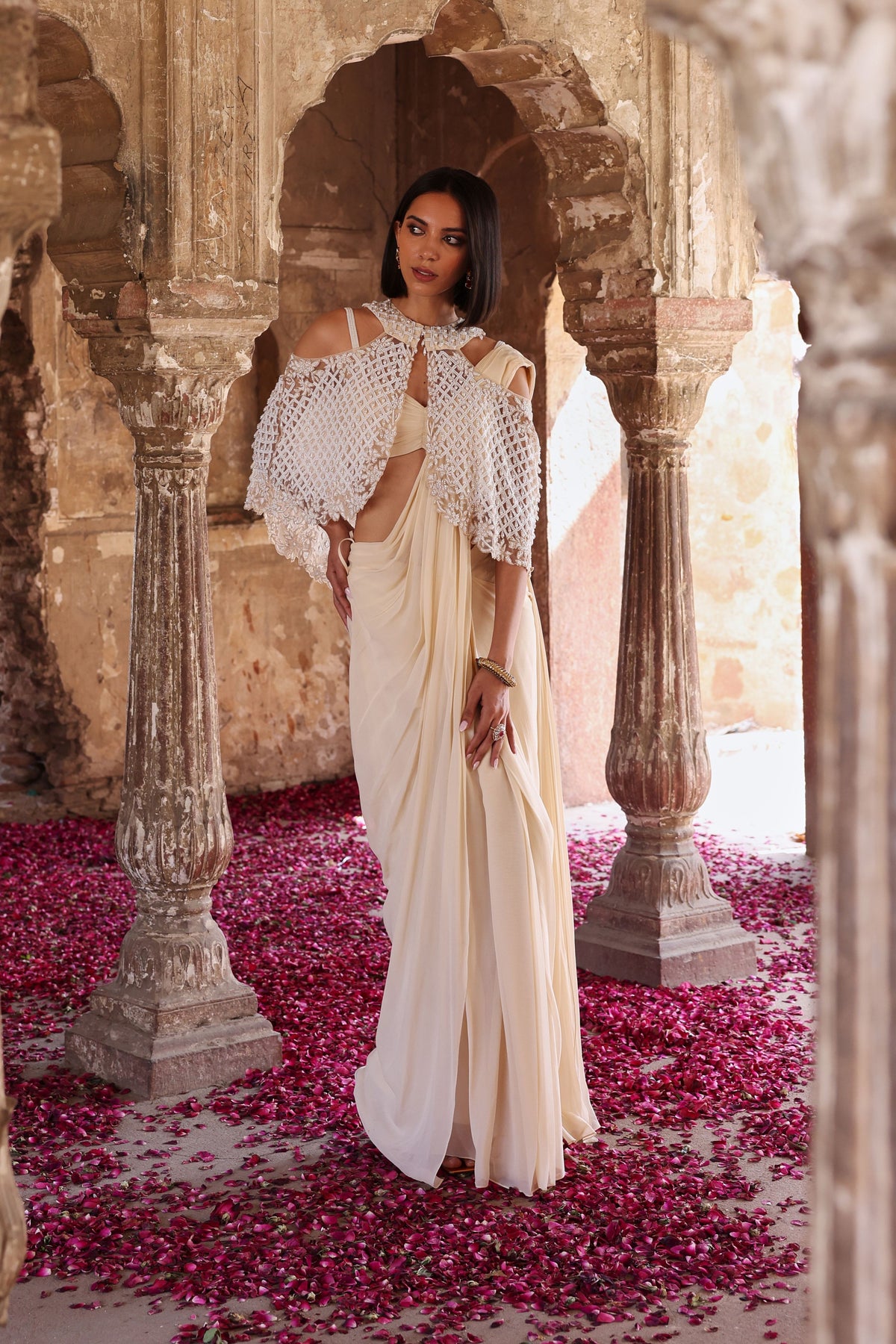 Embellished choli paired with an embellished cape and pre-stitched saree