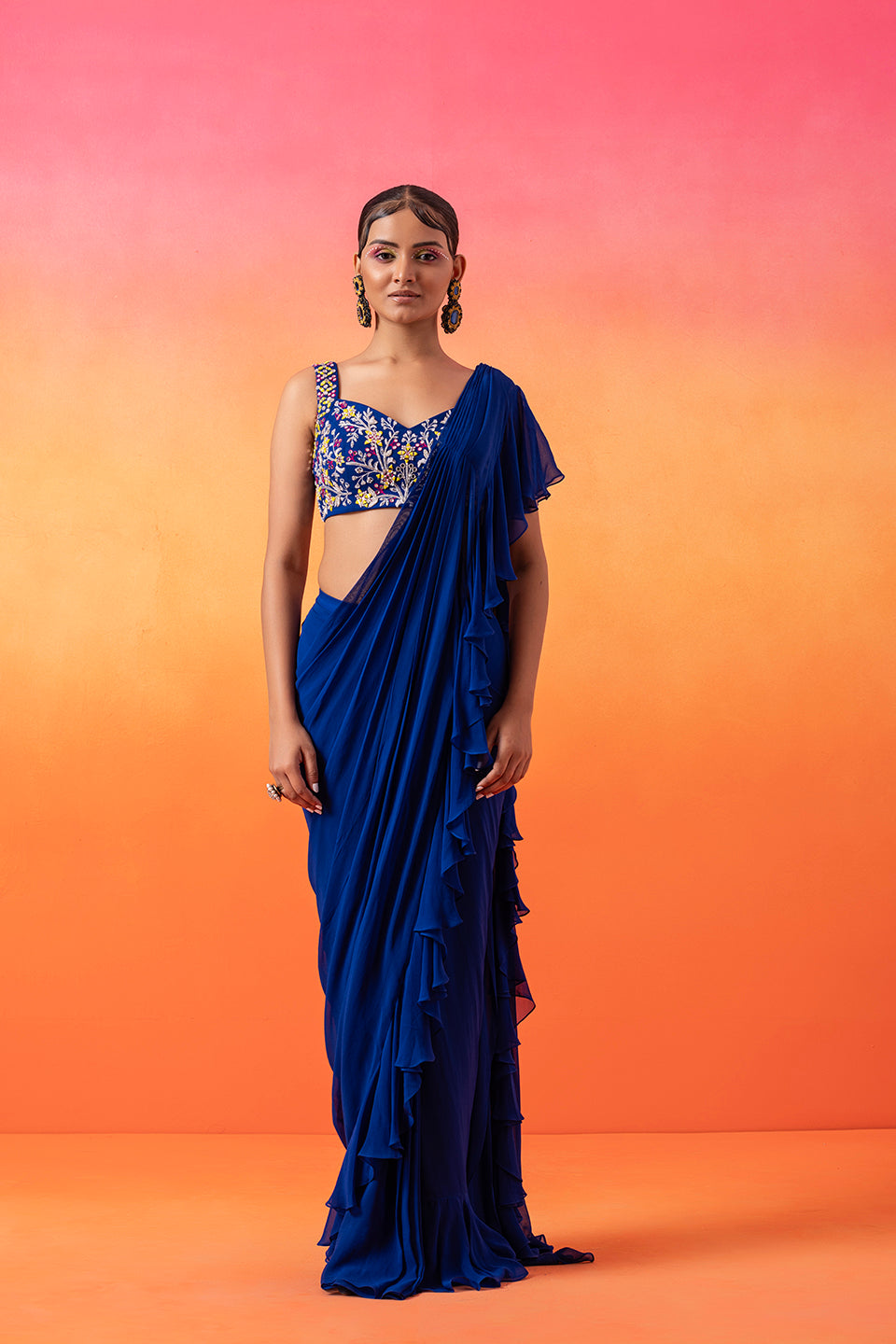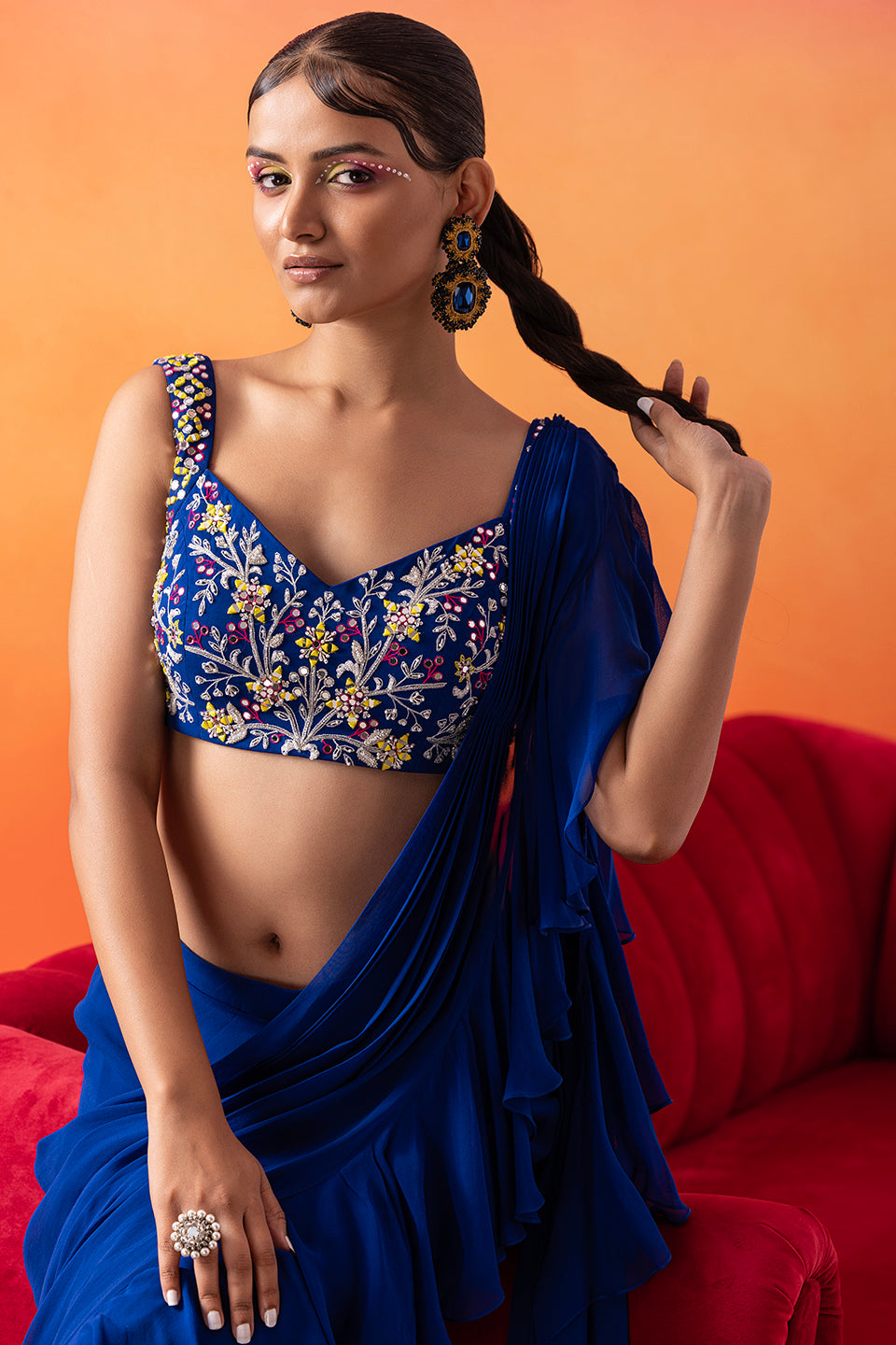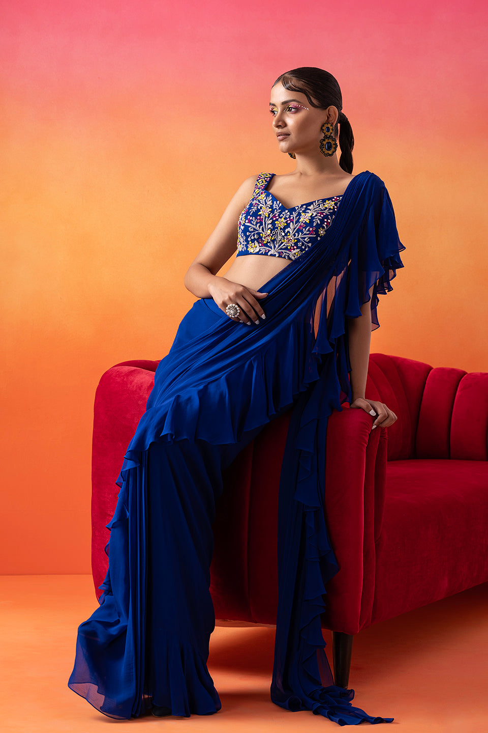 Embellished Choli Paired With A Pre-Stitched Ruffle Saree