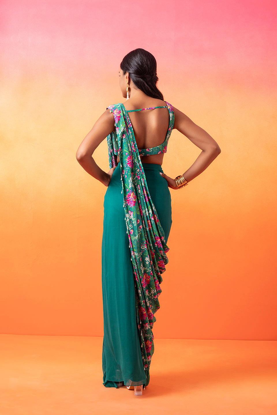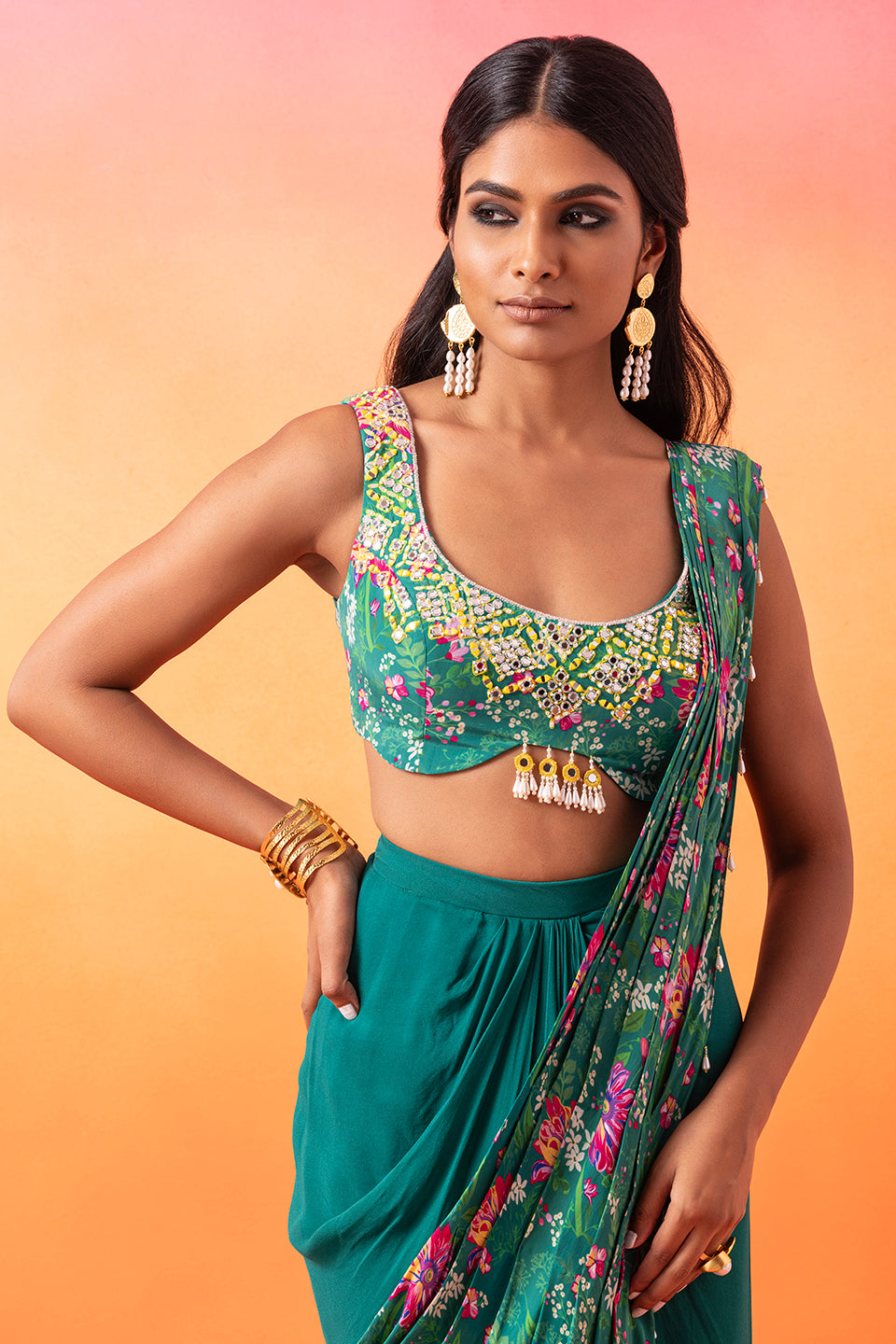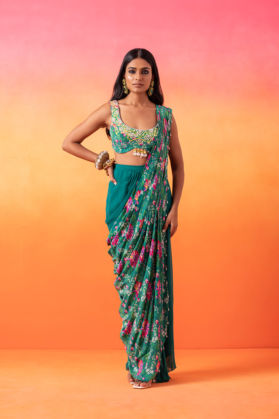 Embellished Printed Choli Paired With A Draped Skirt And Pre-Stitched Printed Pallu Finished With Tassels