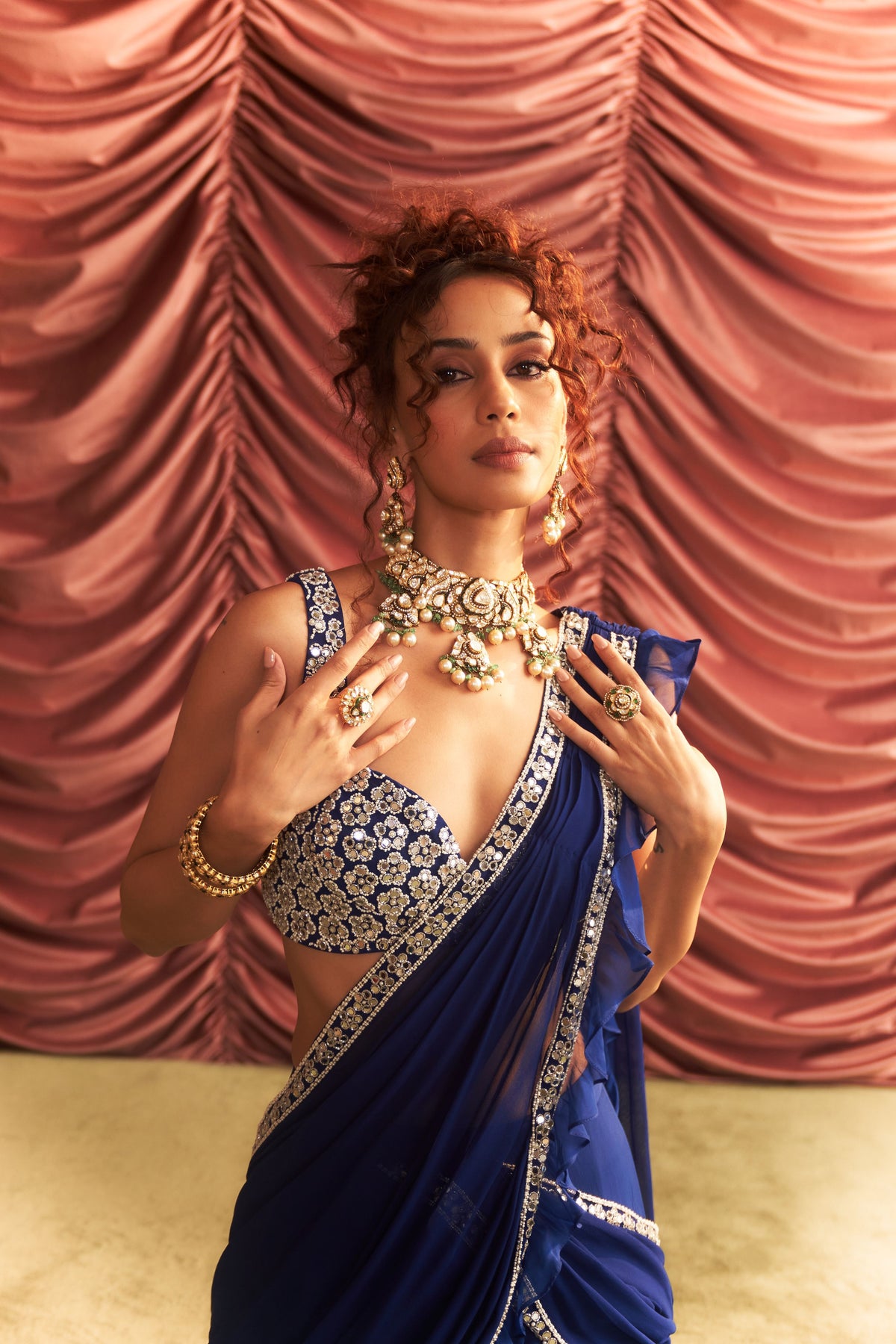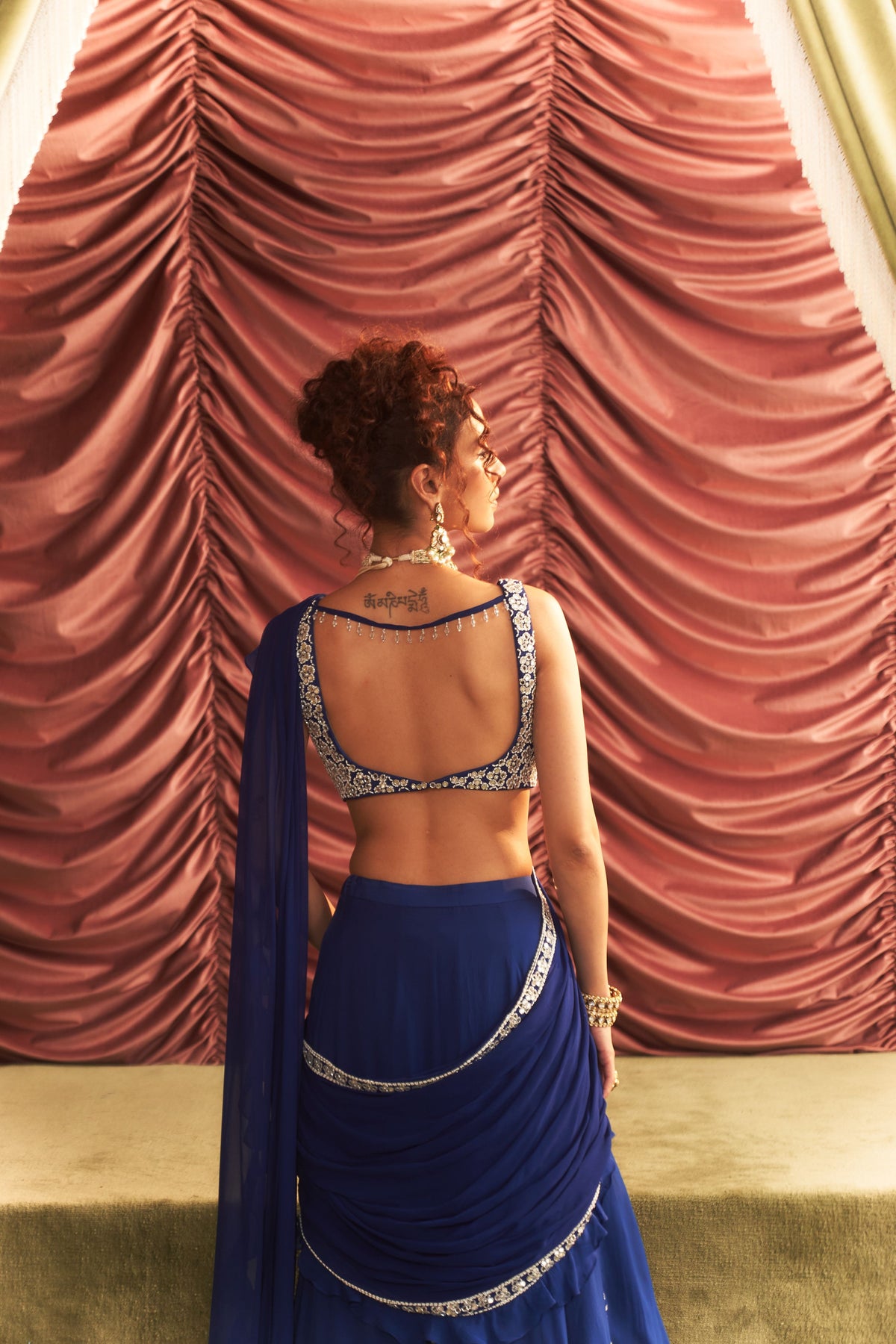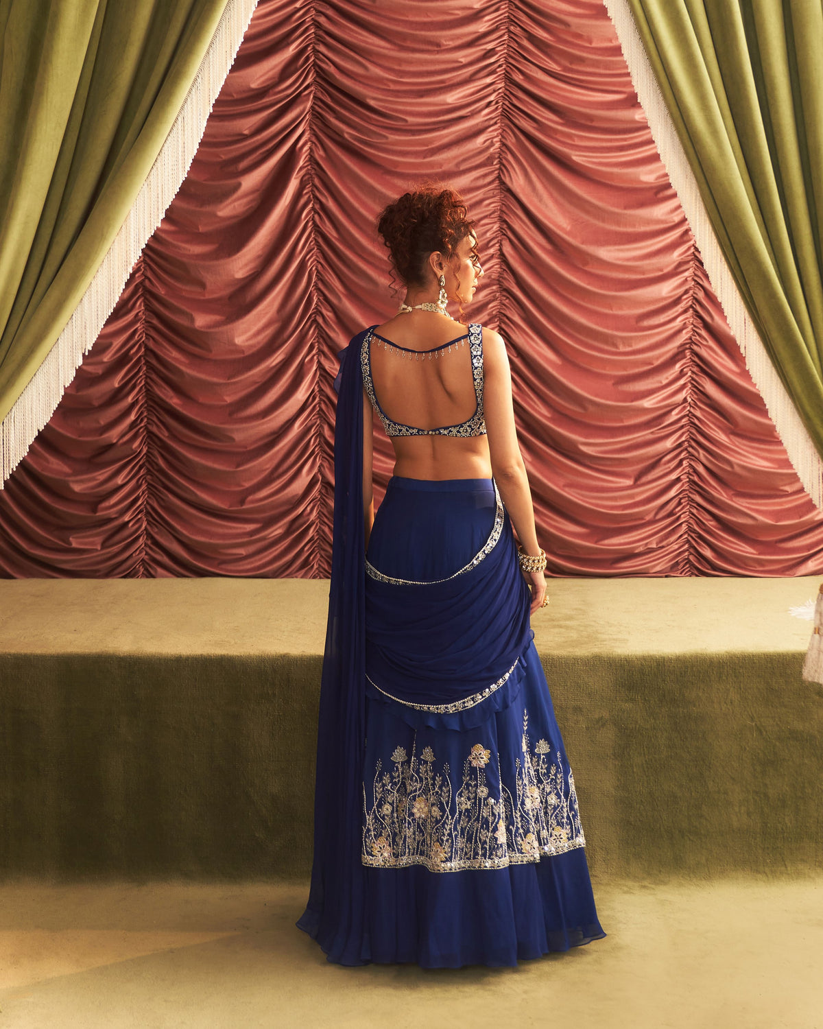 Embellished choli paired with pre-draped lehenga saree with ruffles on pallu