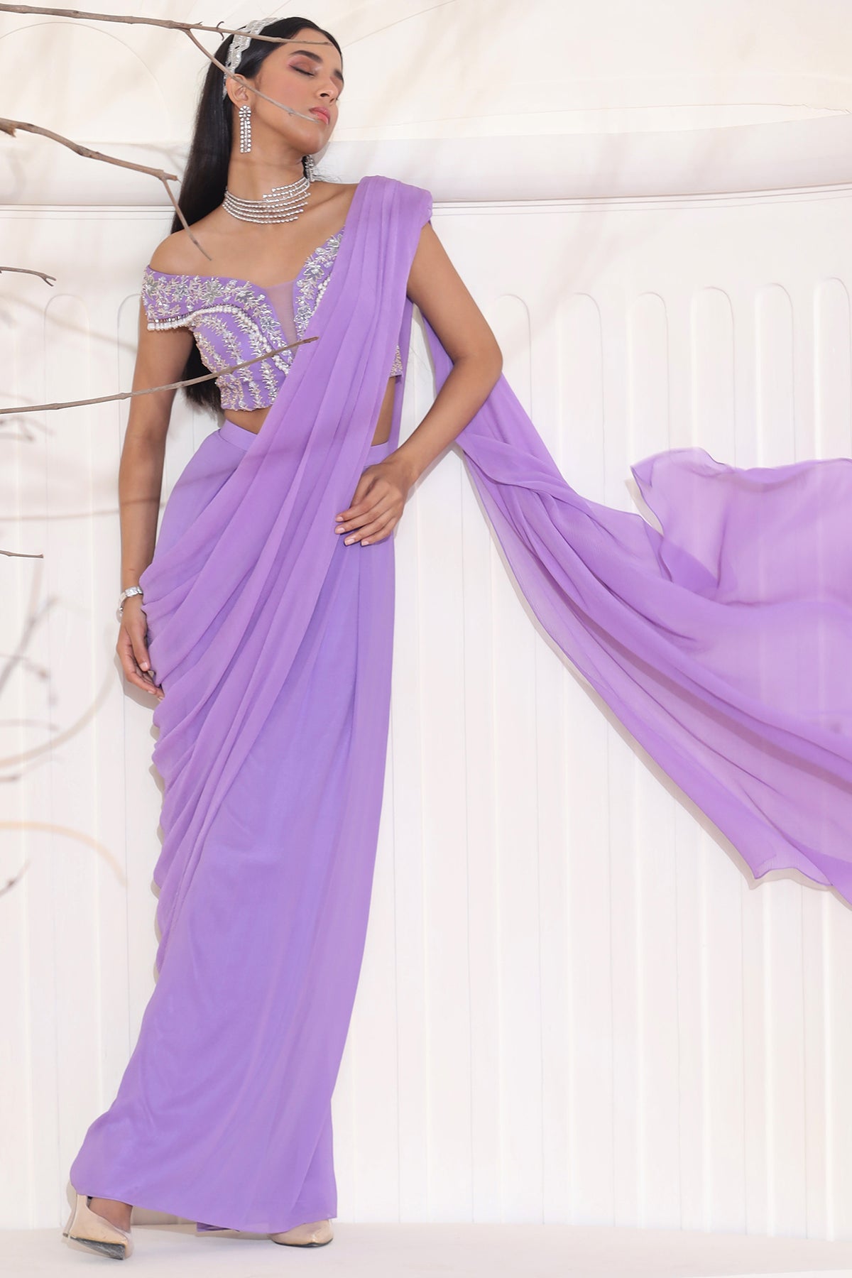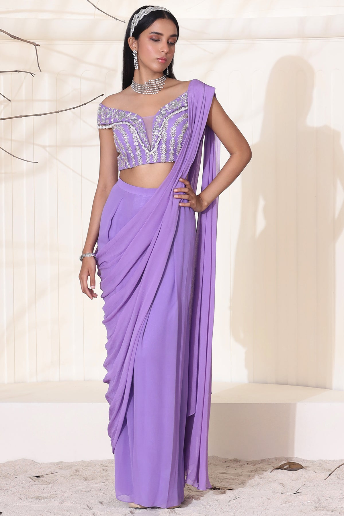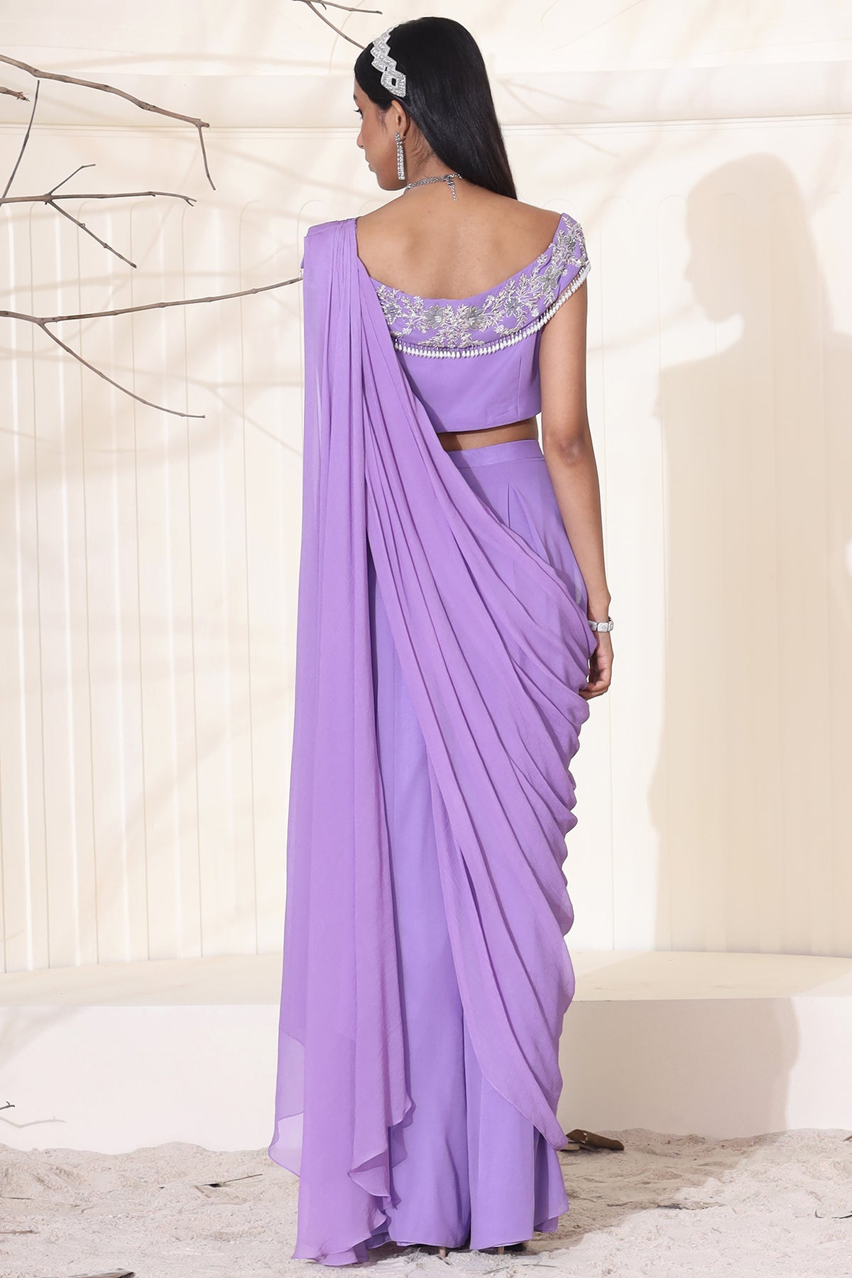 Featuring A Lilac Draped Pant Saree In Chiffon And Georgette Base. It Is Paired With A Matching Blouse Having Pearl Tassels And Embellishments.
