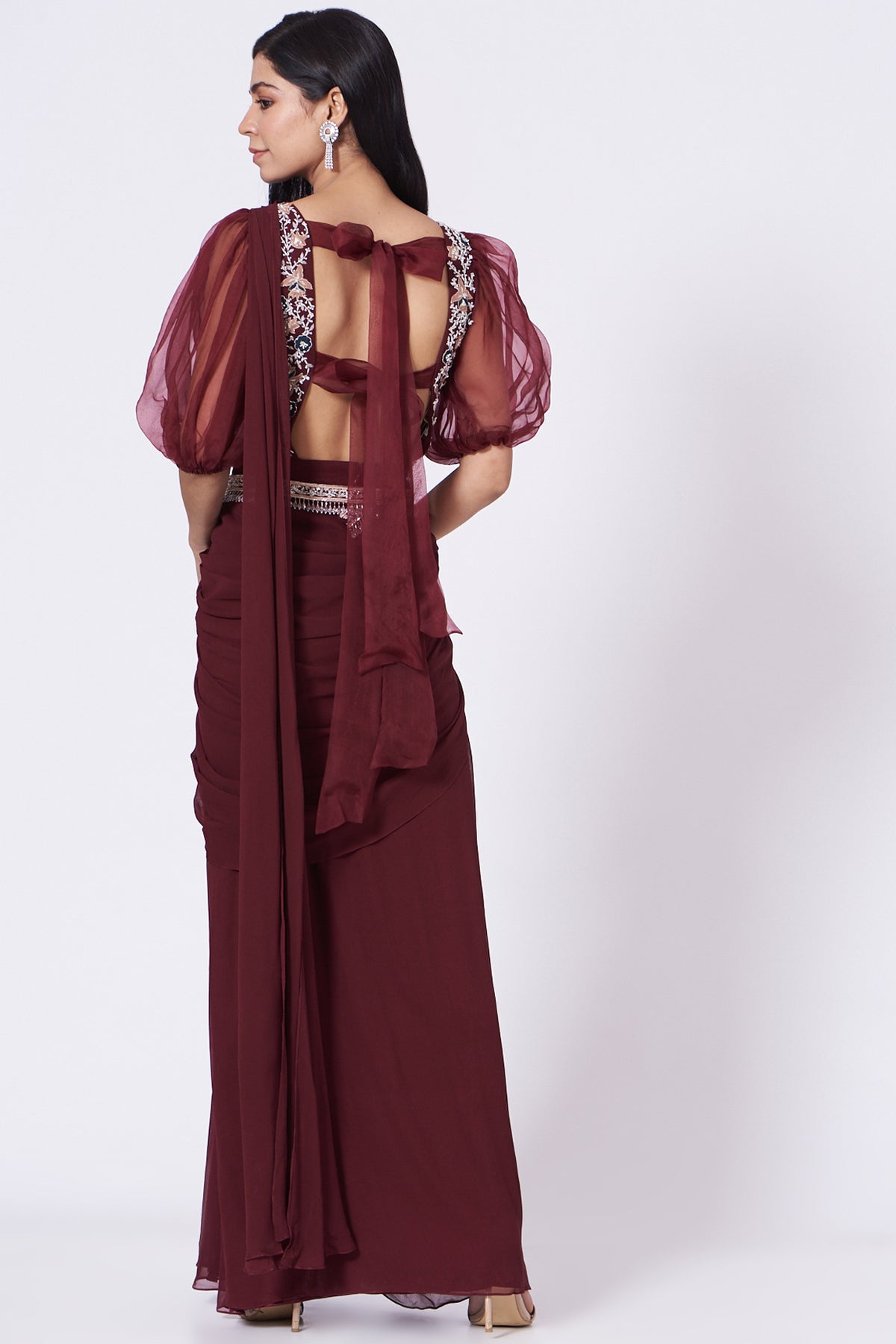 Featuring A Maroon Draped Concept Saree In Georgette Base. It Is Paired With A Matching Hand-Embroidered Blouse Having Puffed Sleeves And An Embellished Belt.