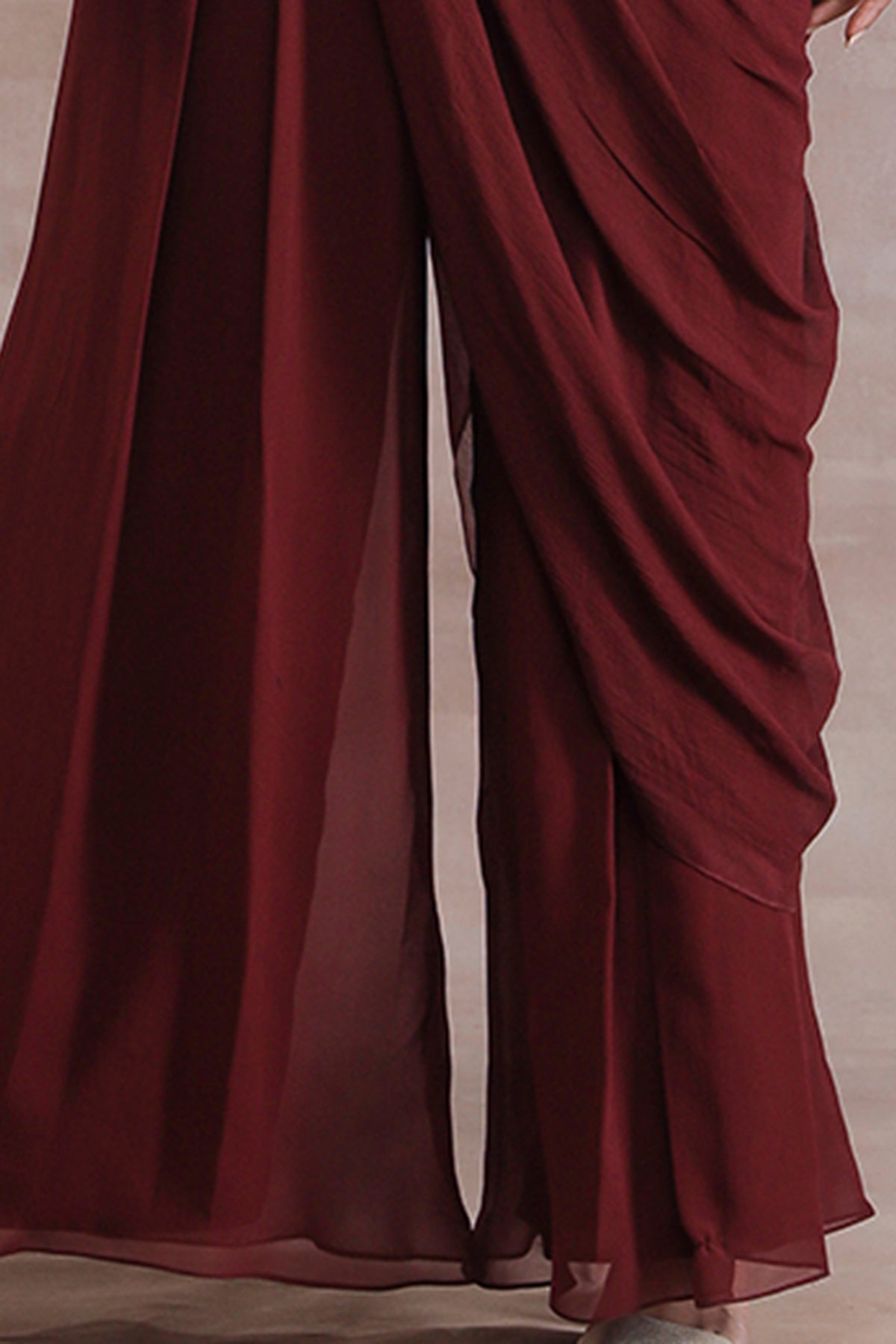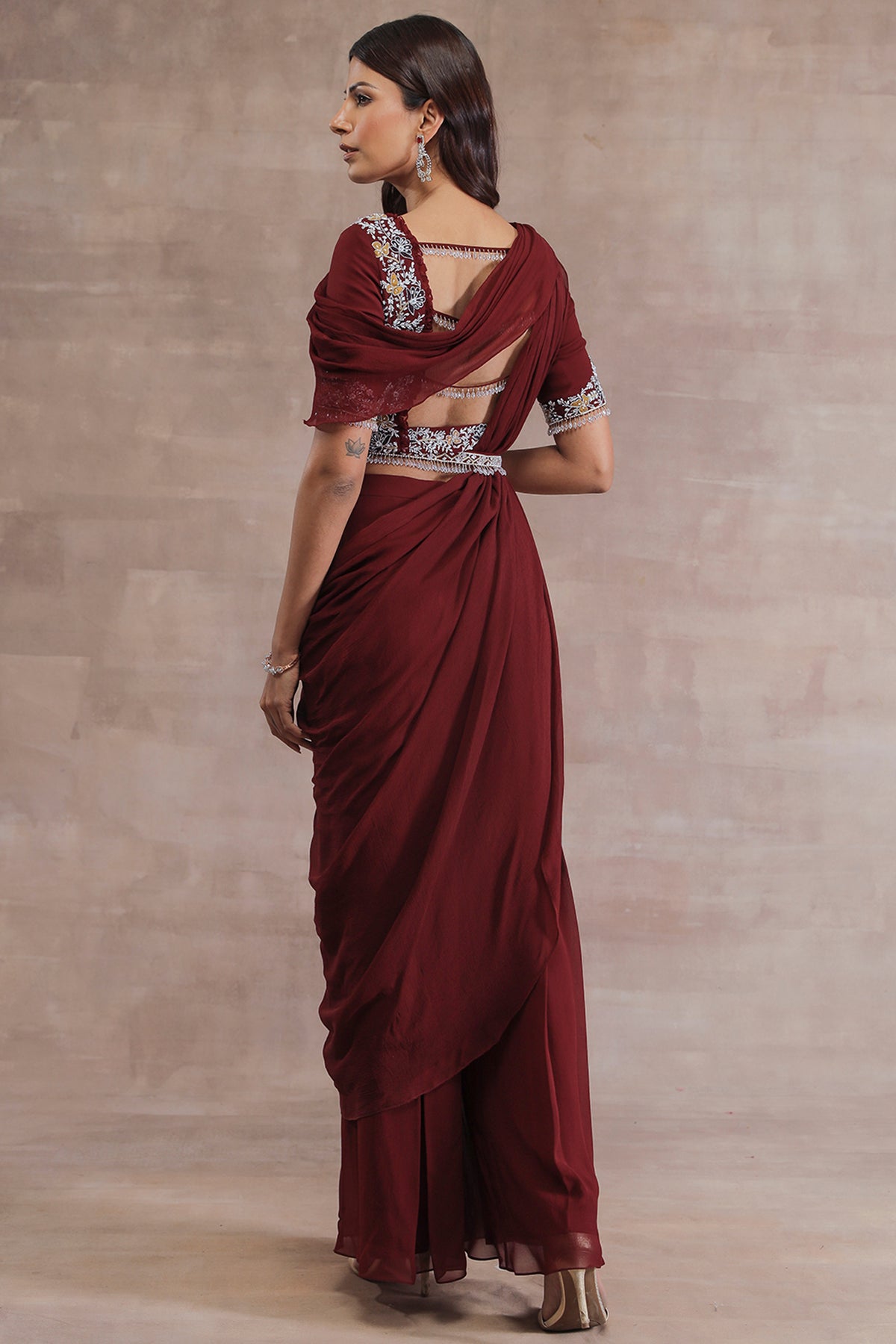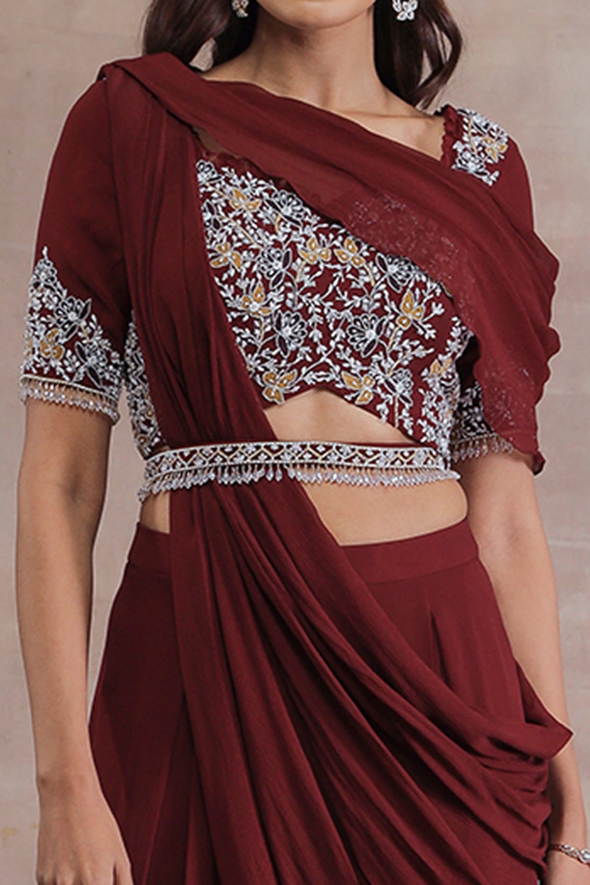 Featuring A Maroon Blouse In Georgette Base With Patch Work, Glass Beads, Crystals, And Sequins Hand Embroidery. It Is Paired With Matching Pleated Pants, Chiffon Draped Pallu And A Belt.