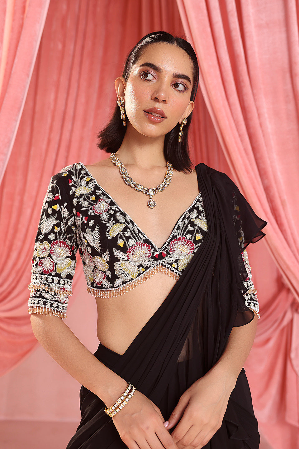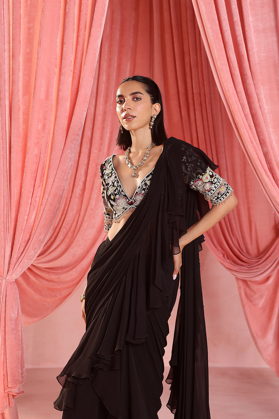 Pre-Stitched Ruffle Saree Paired With An Embellished Choli.