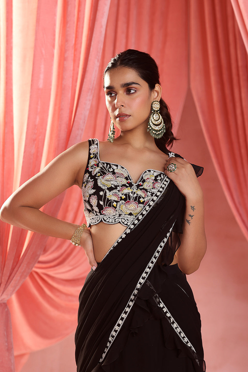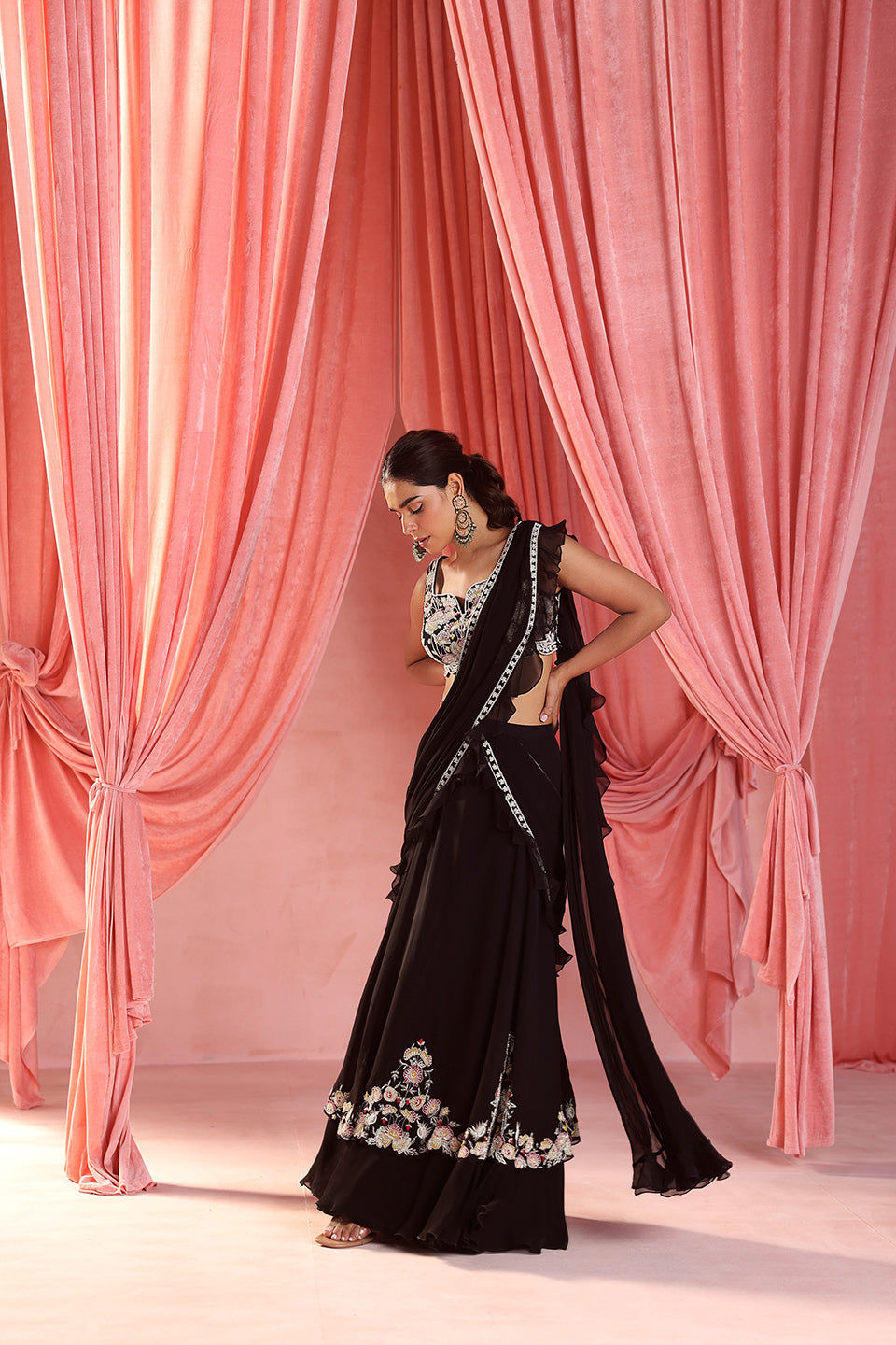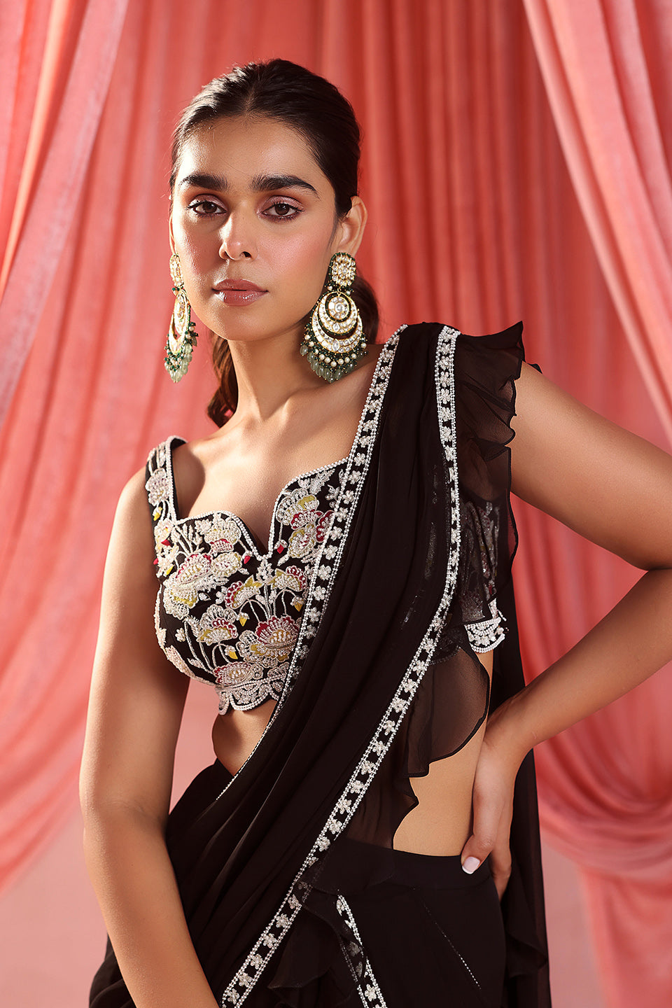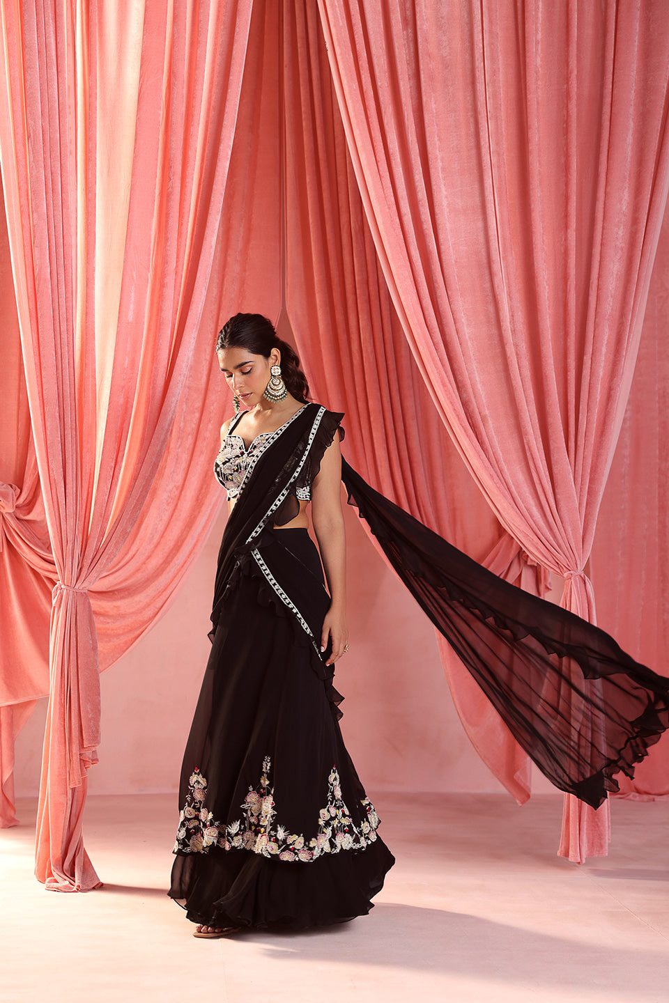 Embellished Choli Paired With A Pre-Stitched Lehenga Saree With Can-Can And Embellishment On The Skirt And Pallu With Attached Ruffles.