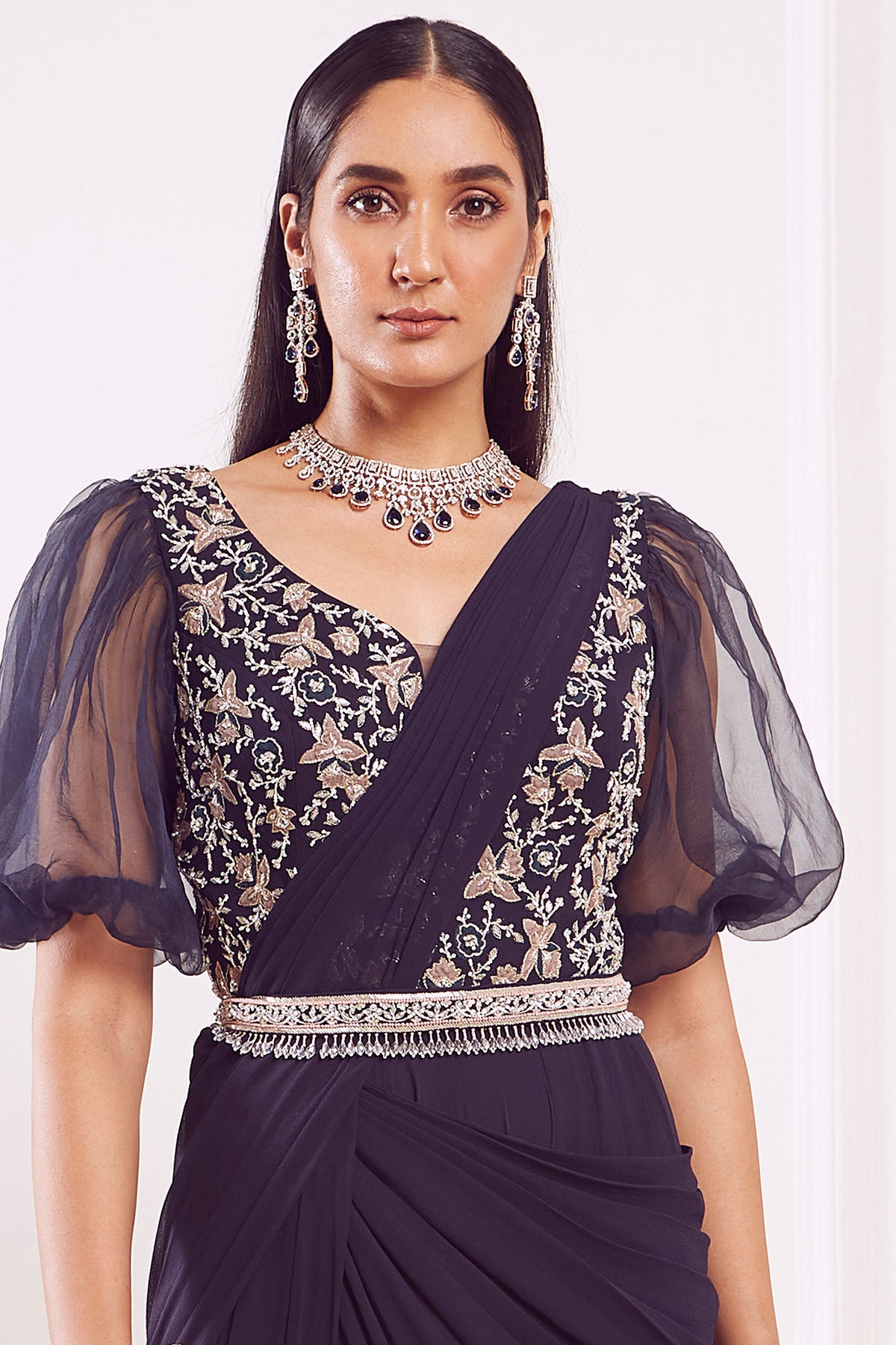 Featuring A Navy Blue Draped Saree In Georgette Base. It Is Paired With A Matching Blouse Having Puffed Organza Sleeves, Glass Beads, Crystal, And Sequins Hand Embroidery, And A Belt.