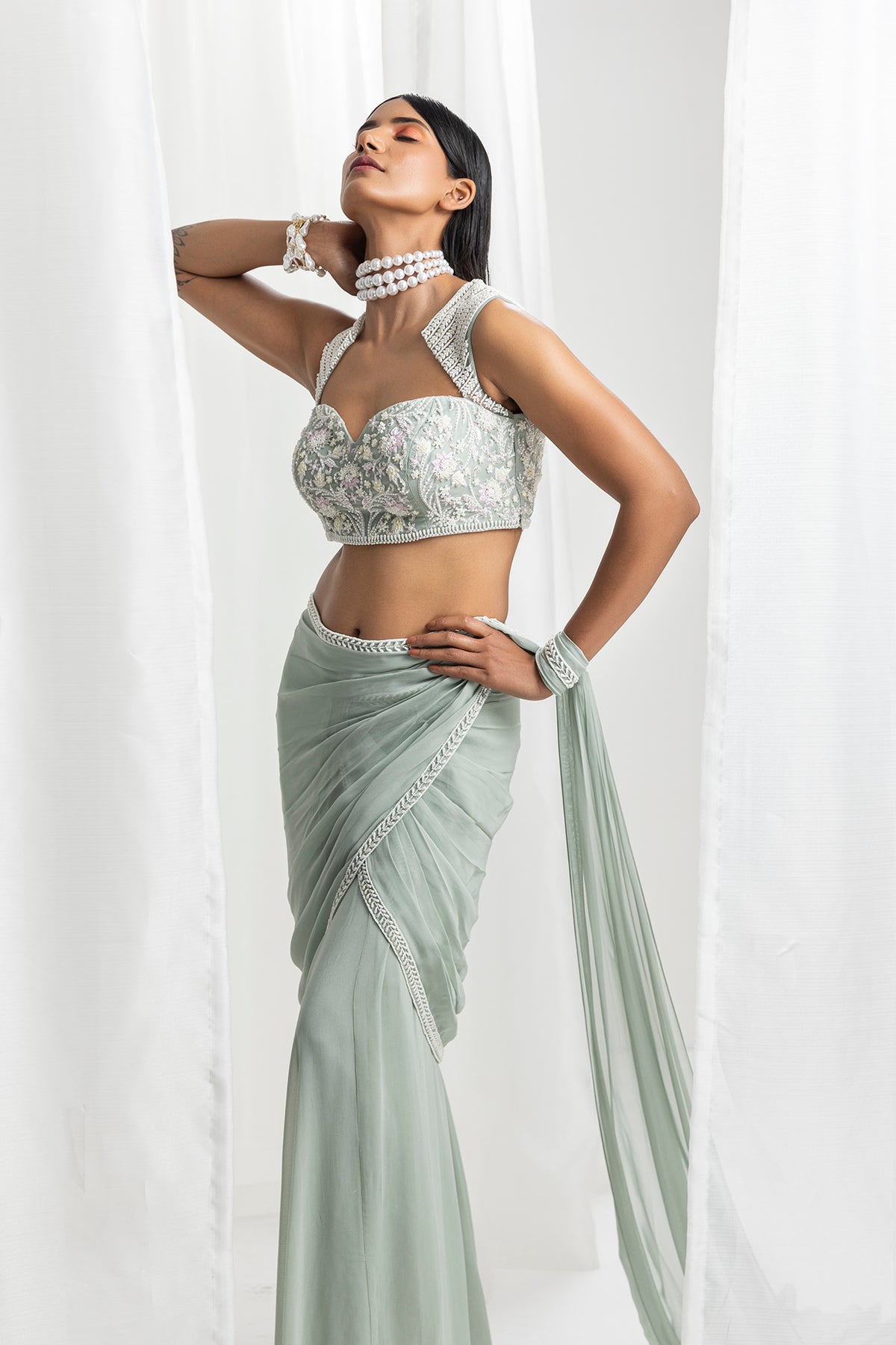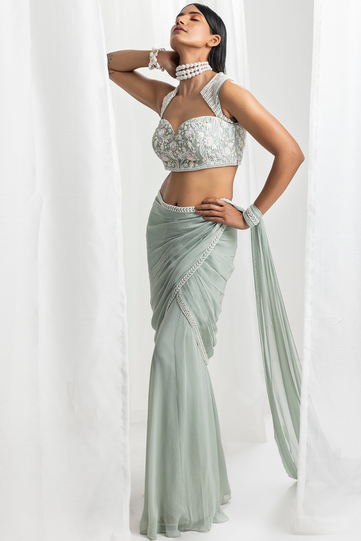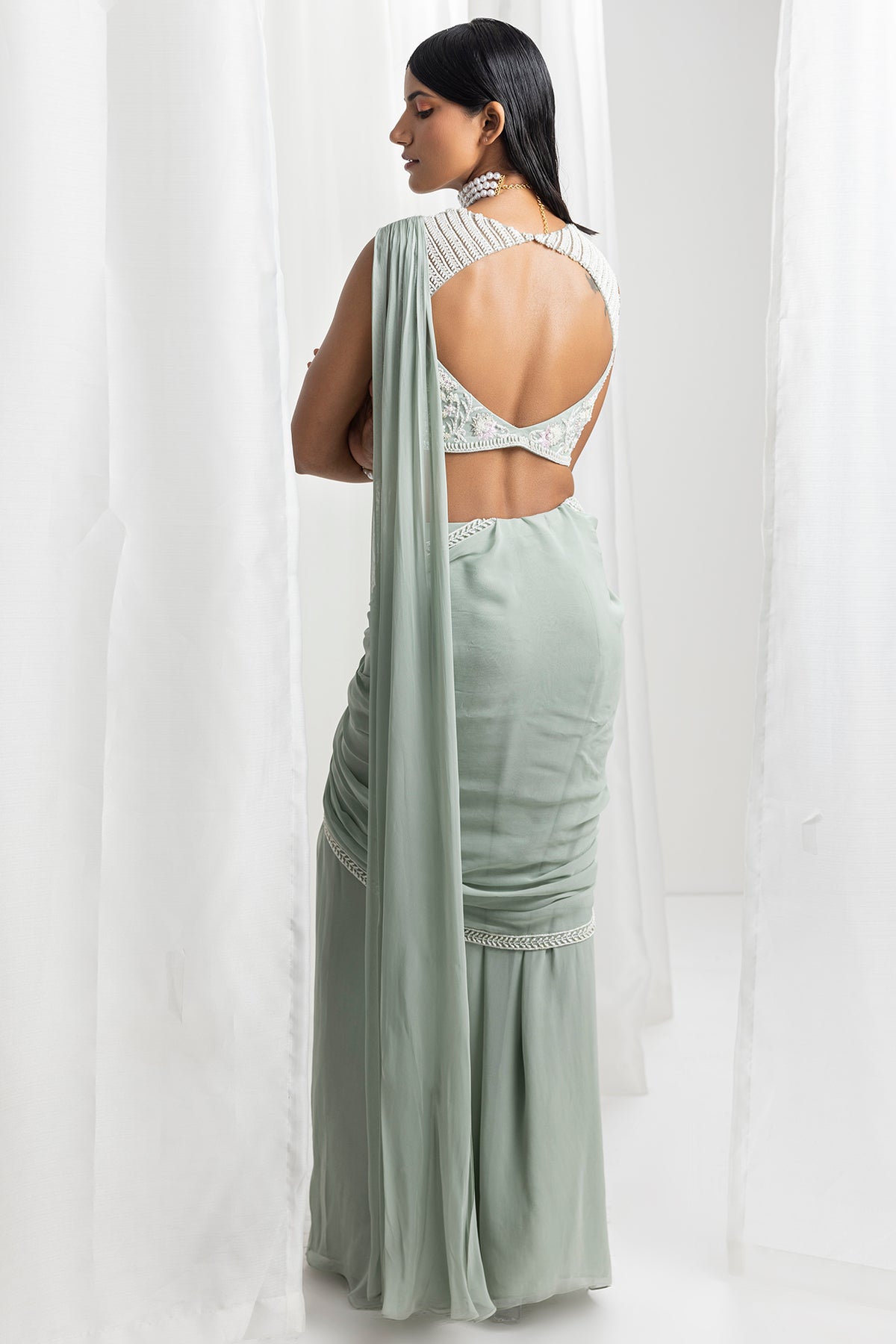 Sage Green Georgette Embellished Pre-Draped Saree Set