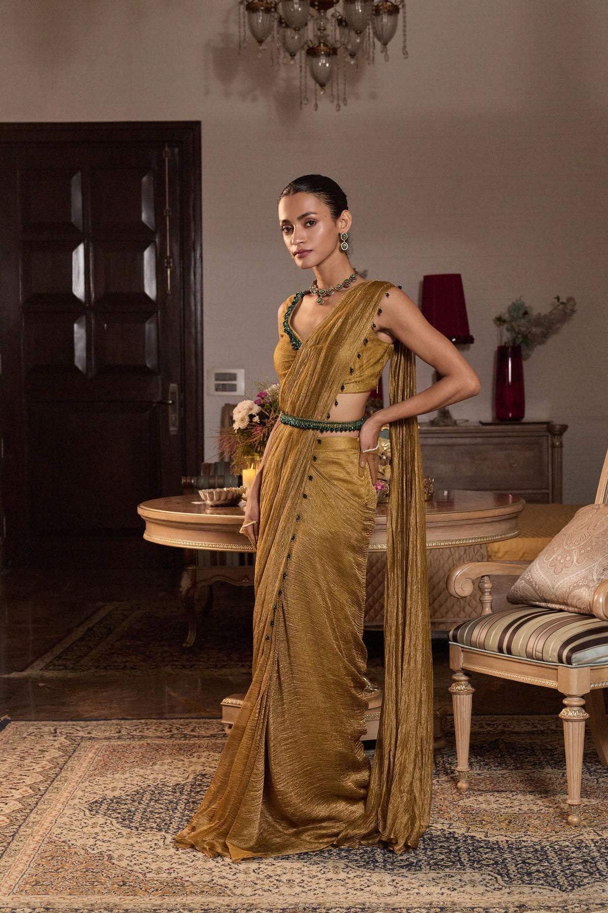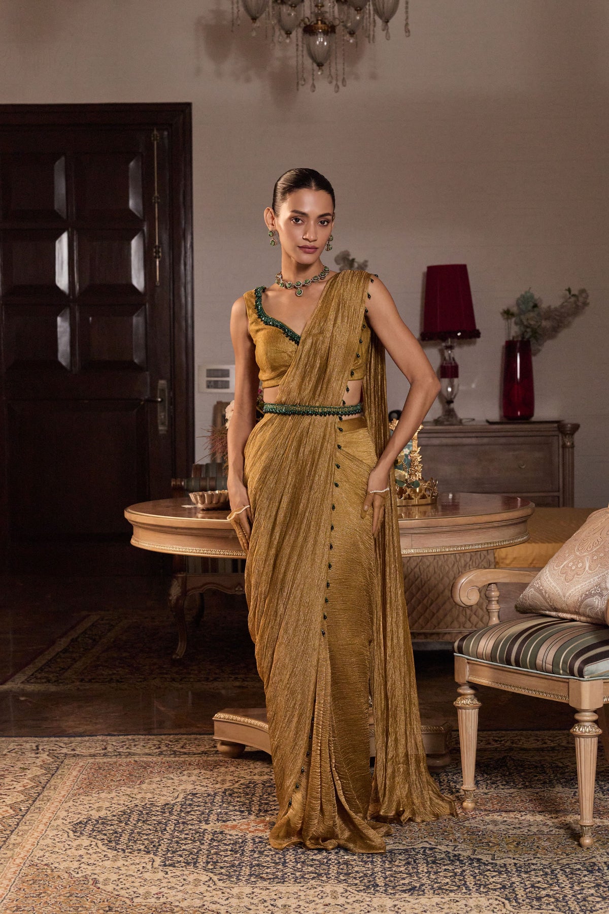 Embellished Choli Paired With A Pre-Stitched Saree And Belt
