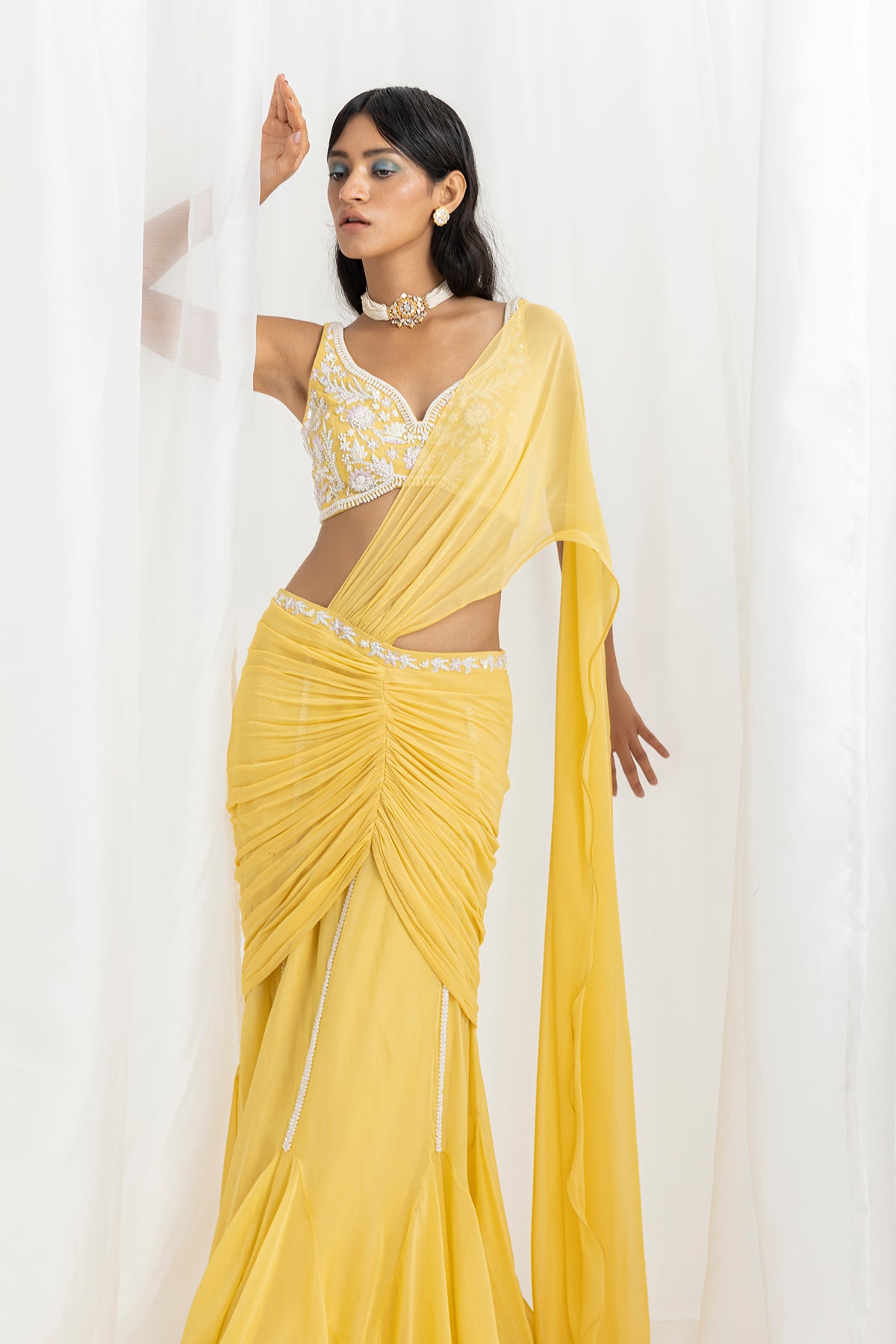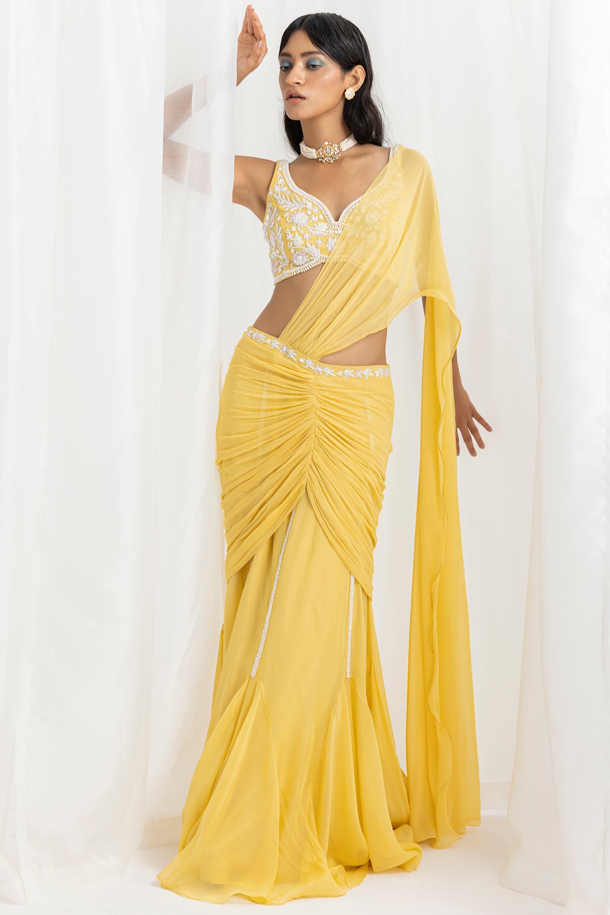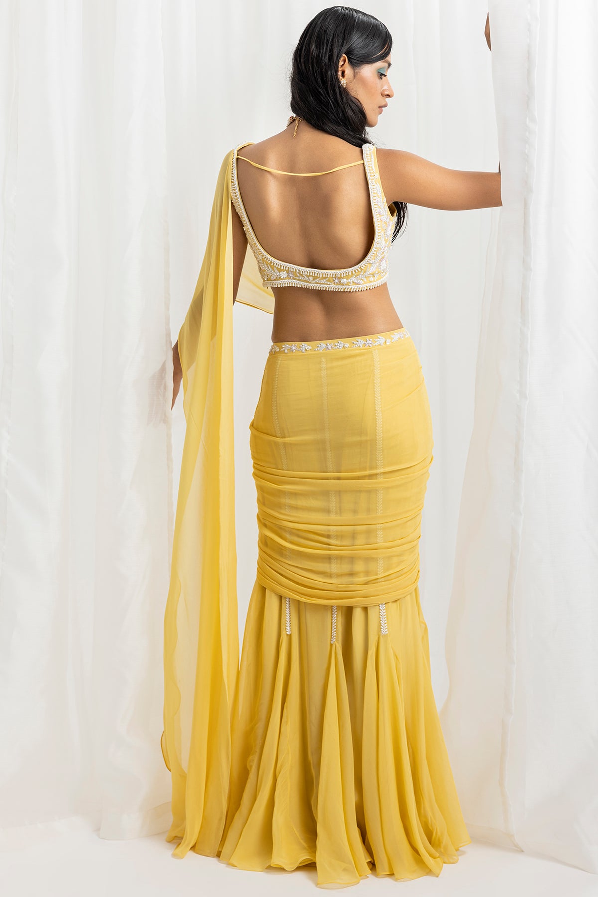 Yellow Organza & Georgette Embellished Pre-Stitched Flared Saree Set