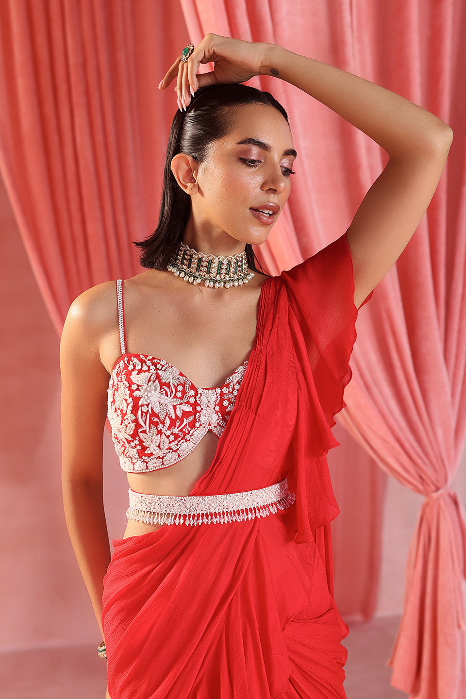 Embellished Choli Paired With A Pre-Stitched Ruffle Saree And Embellished Belt With Tassels