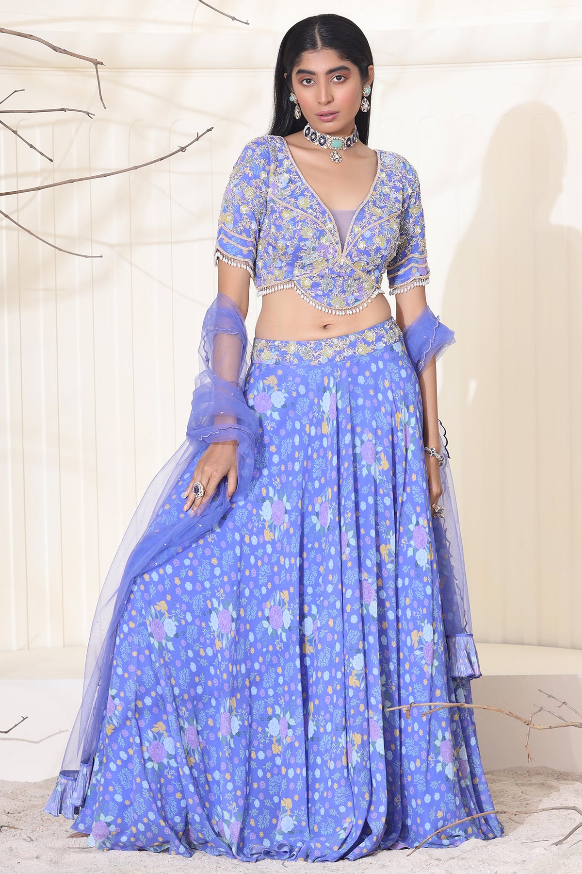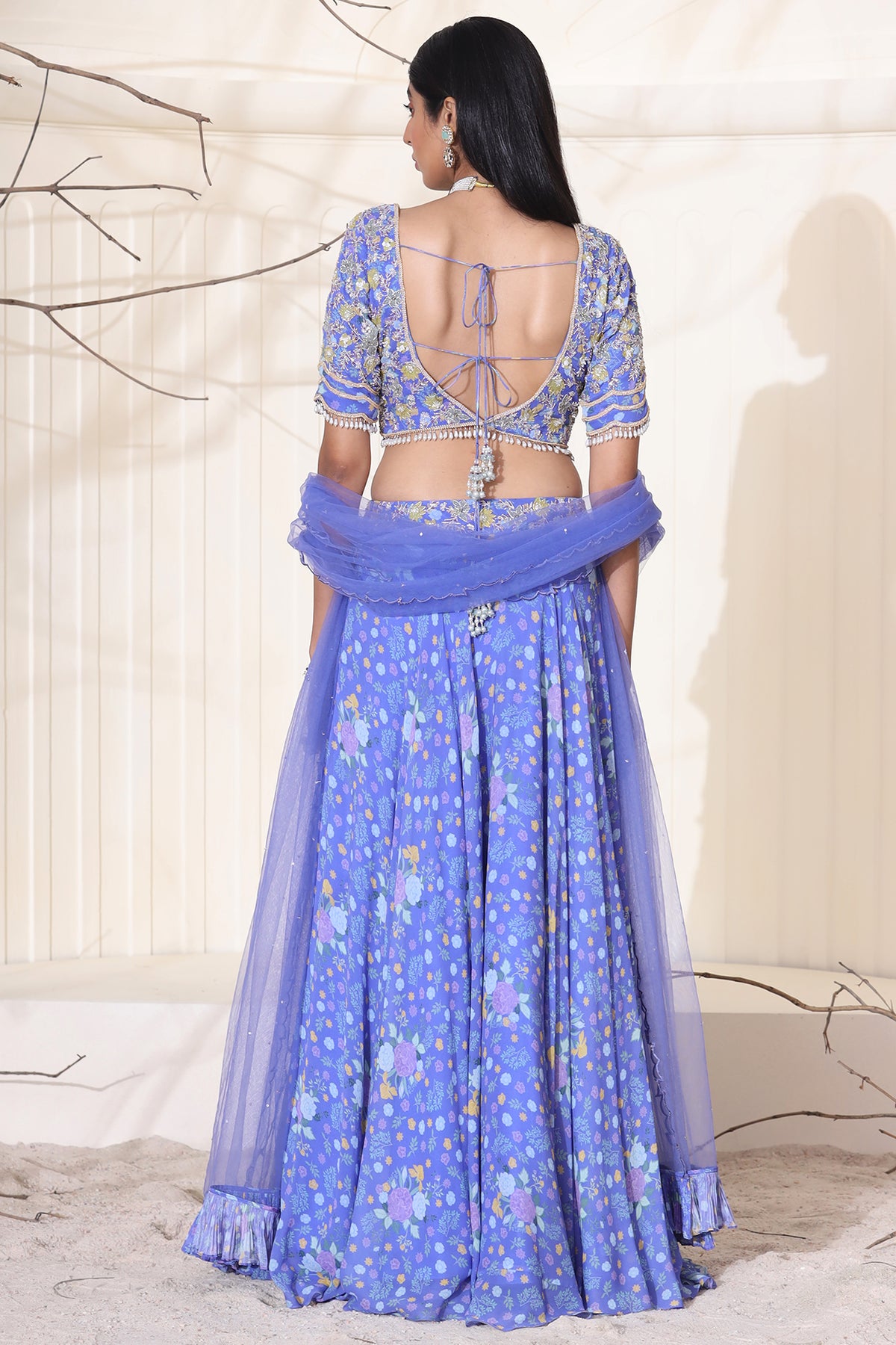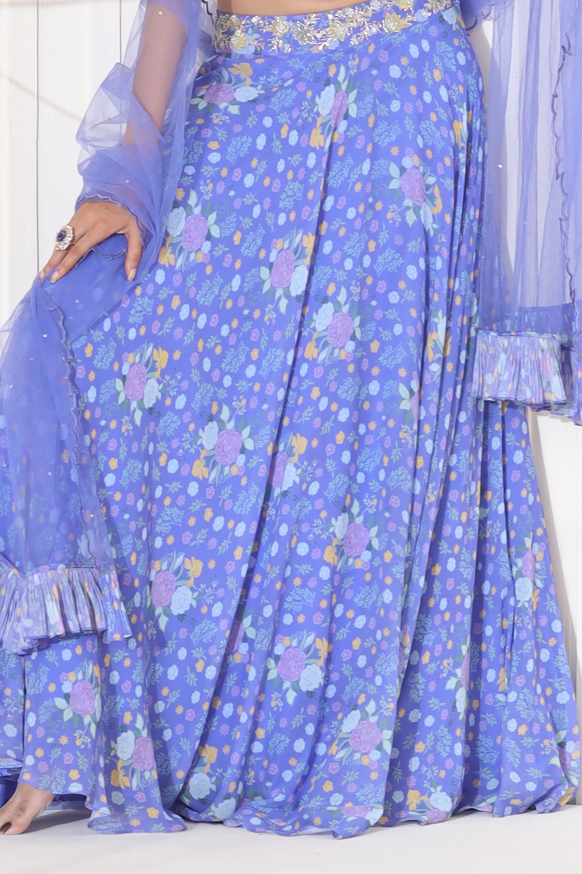 Featuring A Purple Lehenga In Printed Georgette Base With Glass Beads, Beads, And Sequins Hand Embroidered Organza Patchwork. It Is Paired With A Matching Printed Chiffon Blouse And A Net Frilled Dupatta