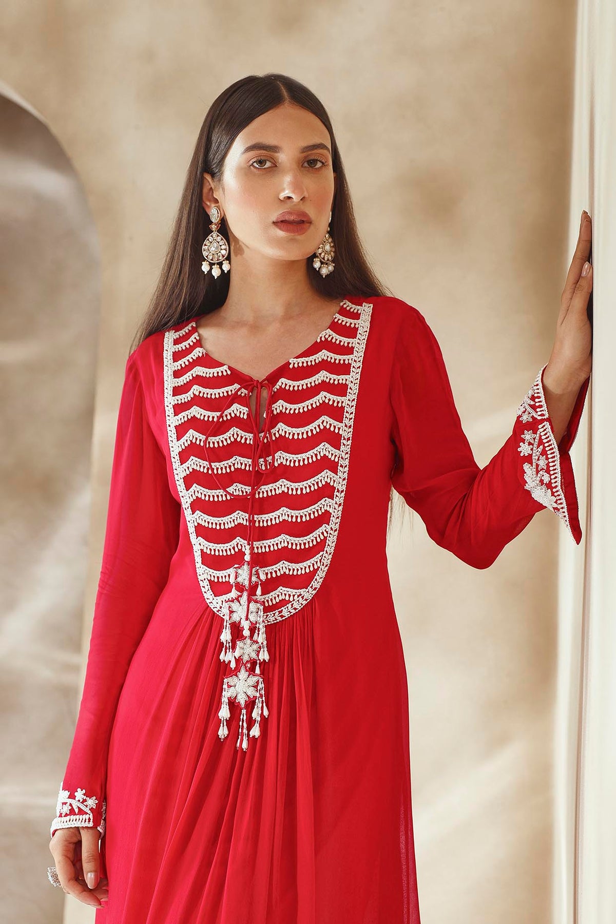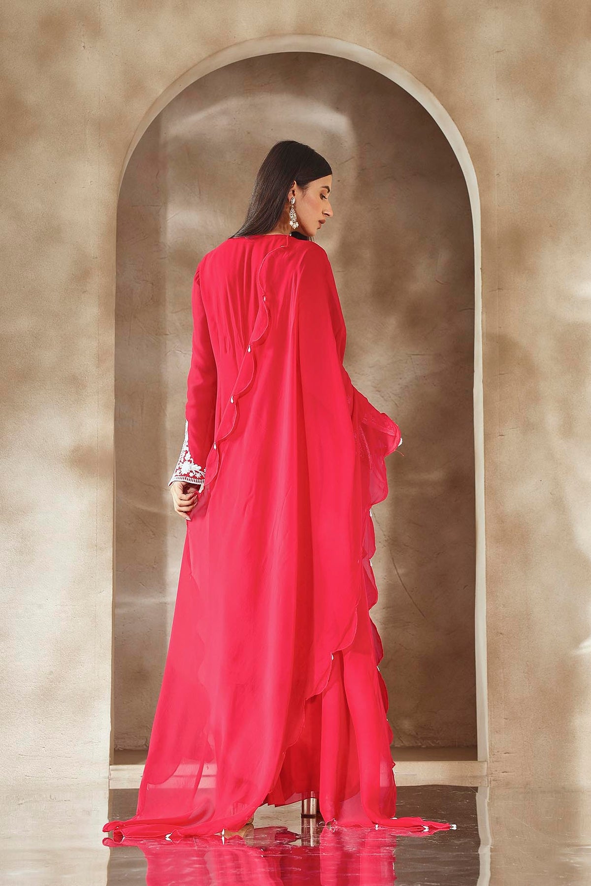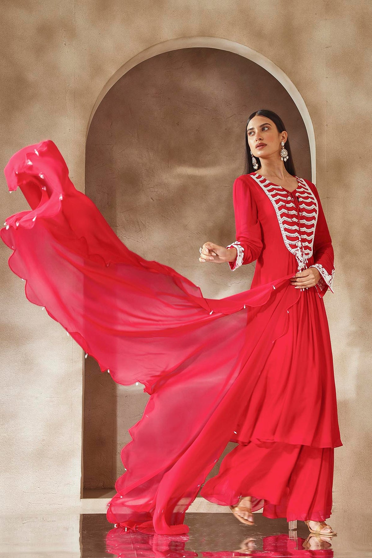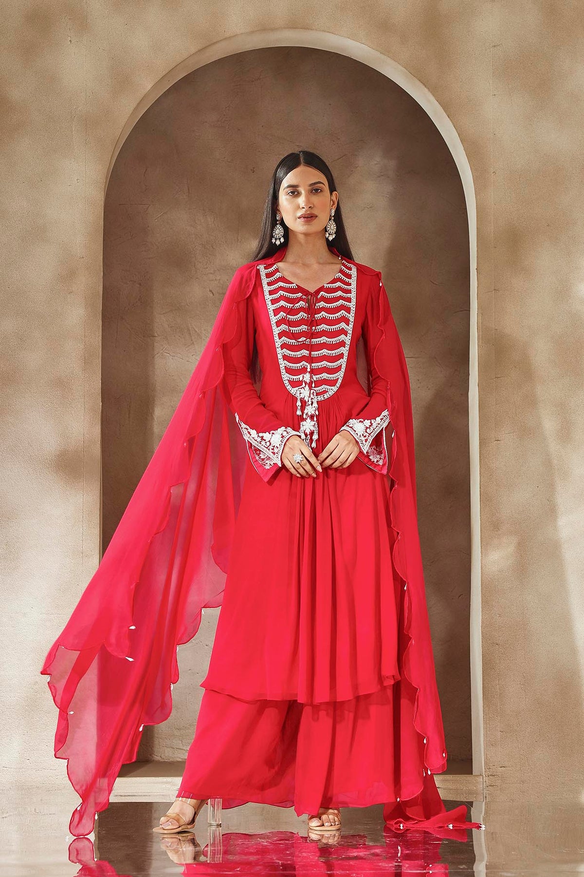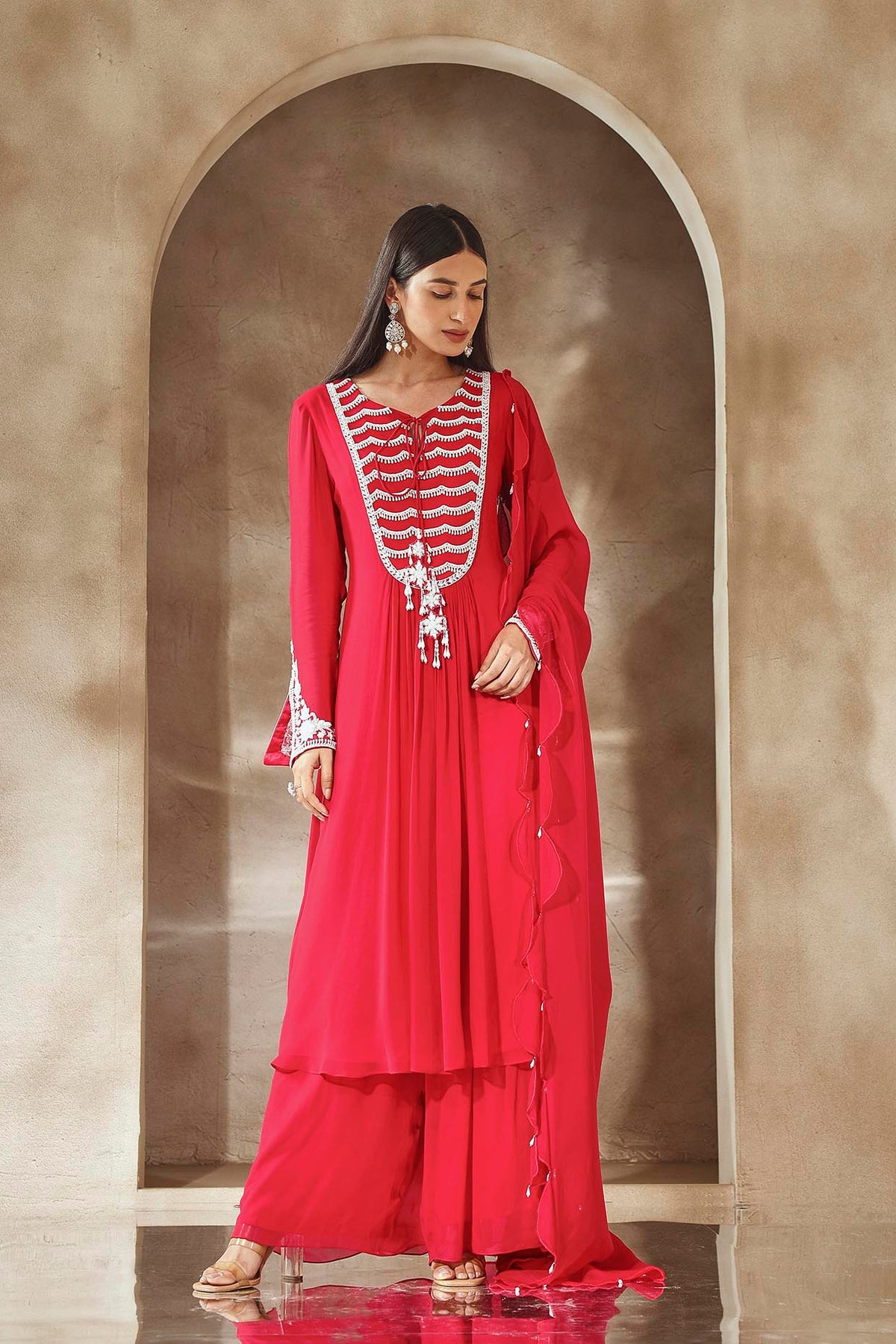 Kurta With An Embellished Neckline And Sleeves Paired With Pleated Pants And Scalloped Organza Dupatta.